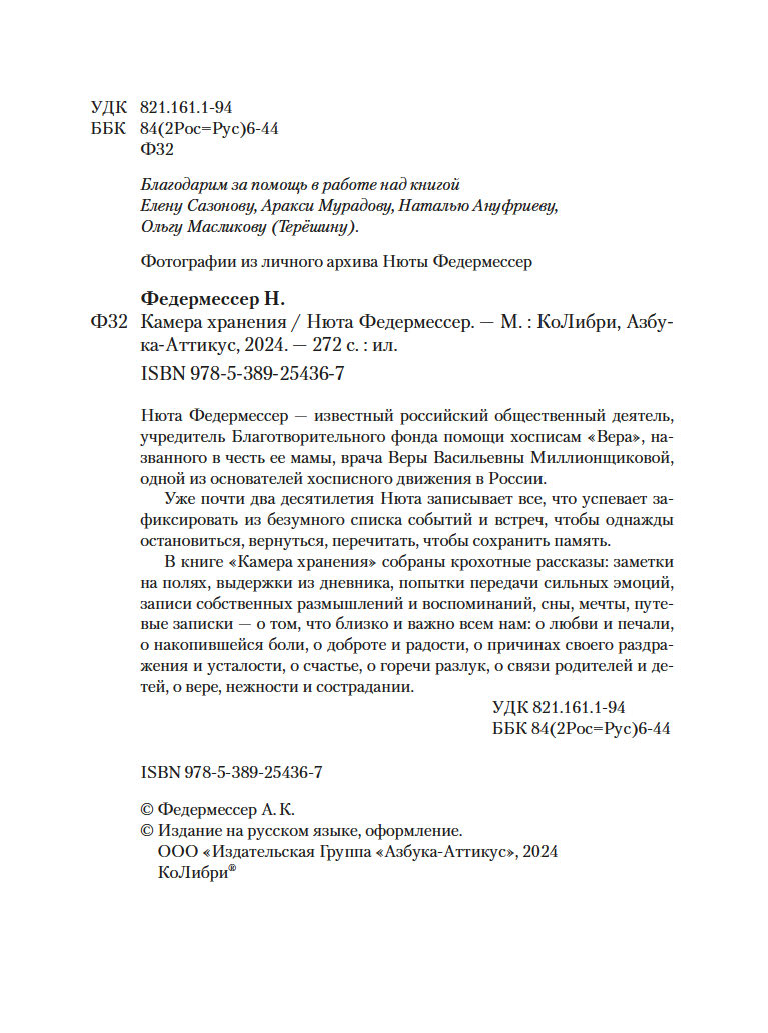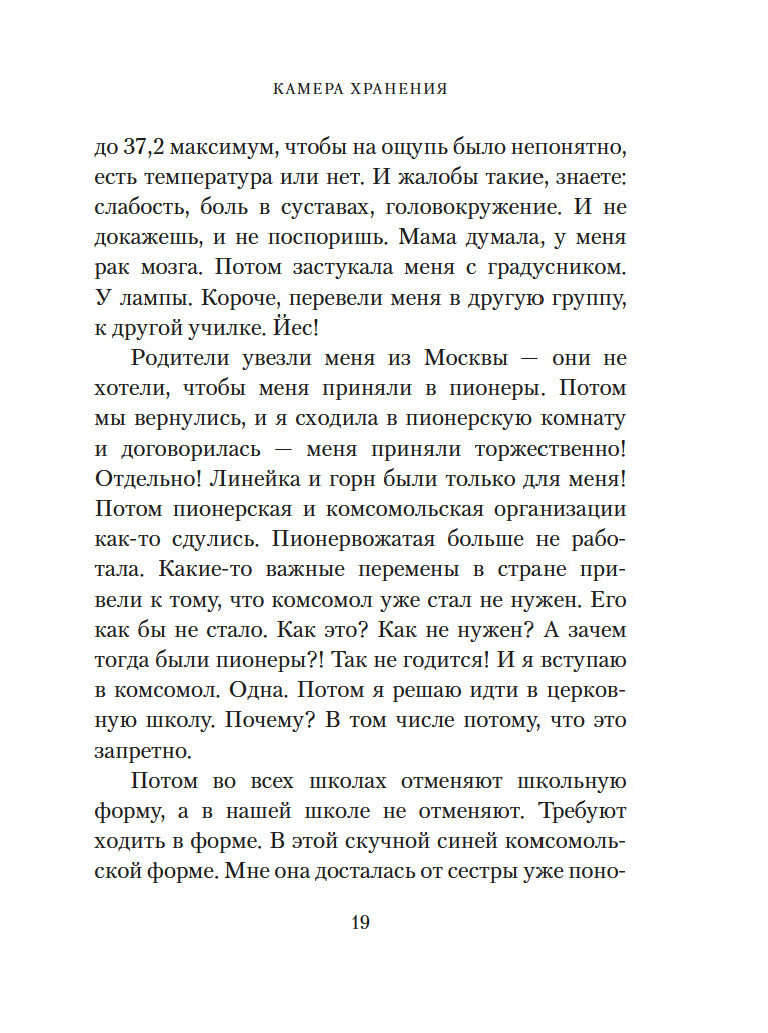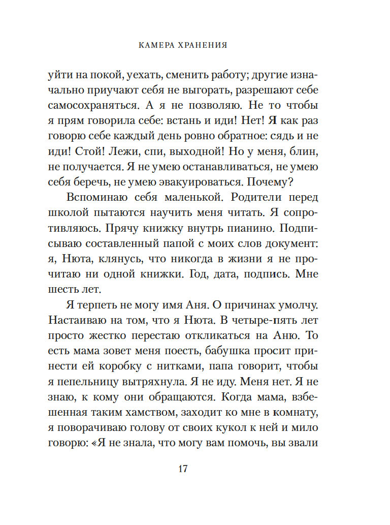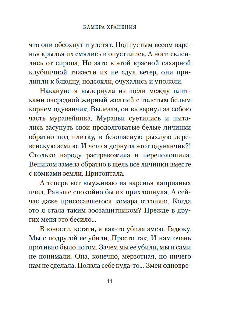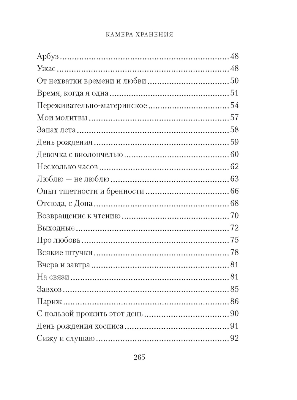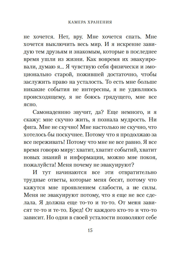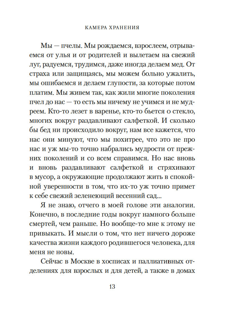 В книге "Камера хранения" собраны крохотные рассказы: заметки на полях, выдержки из дневника, попытки передачи сильных эмоций, записи собственных размышлений и воспоминаний, сны, мечты, путевые записки – о том, что близко и важно всем нам: о любви и печали, о накопившейся боли, о доброте и радости, о причинах своего раздражения и усталости, о счастье, о горечи разлук, о связи родителей и детей, о вере, нежности и сострадании.