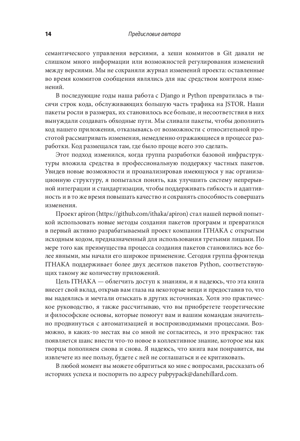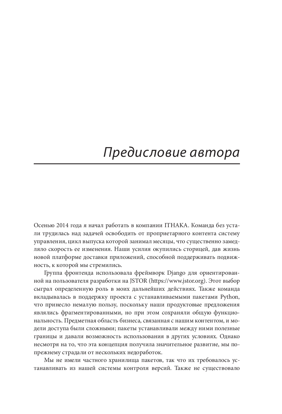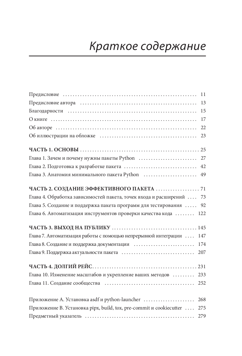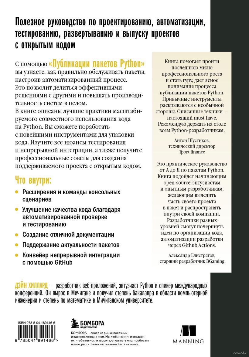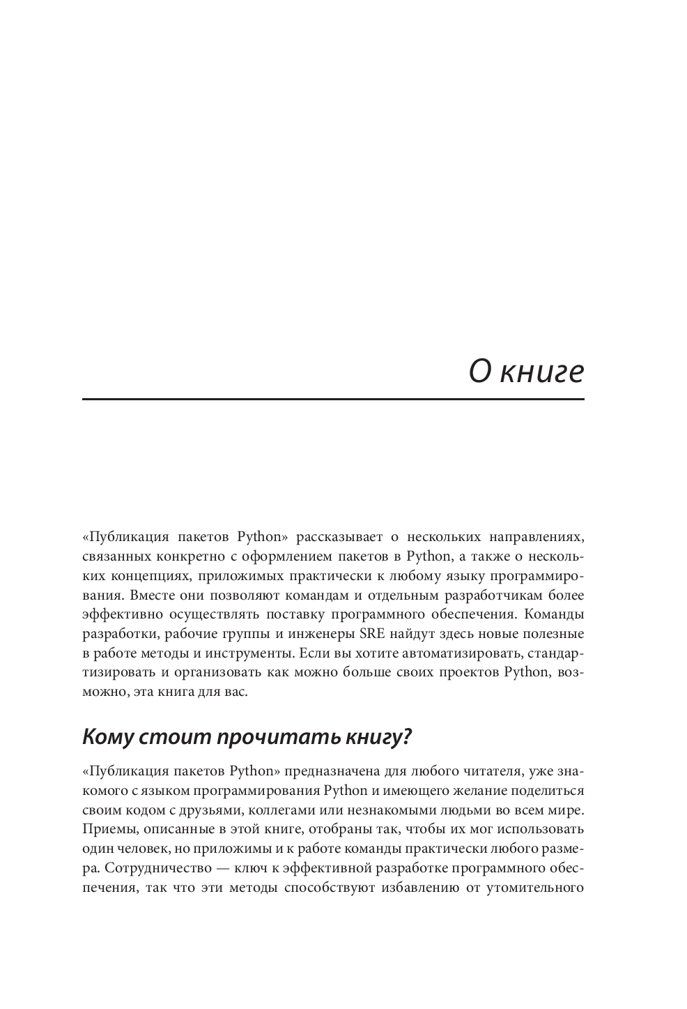 В книге описаны лучшие практики масштабируемого совместного использования кода на Python. Вы сможете поработать с новейшими инструментами для упаковки кода. Изучите все нюансы тестирования и непрерывной интеграции, а также получите профессиональные советы для создания поддерживаемого проекта с открытым кодом.