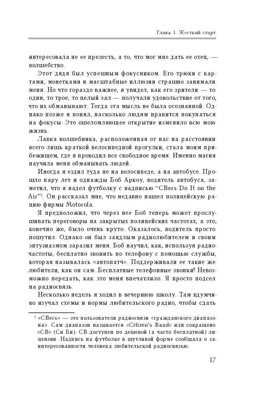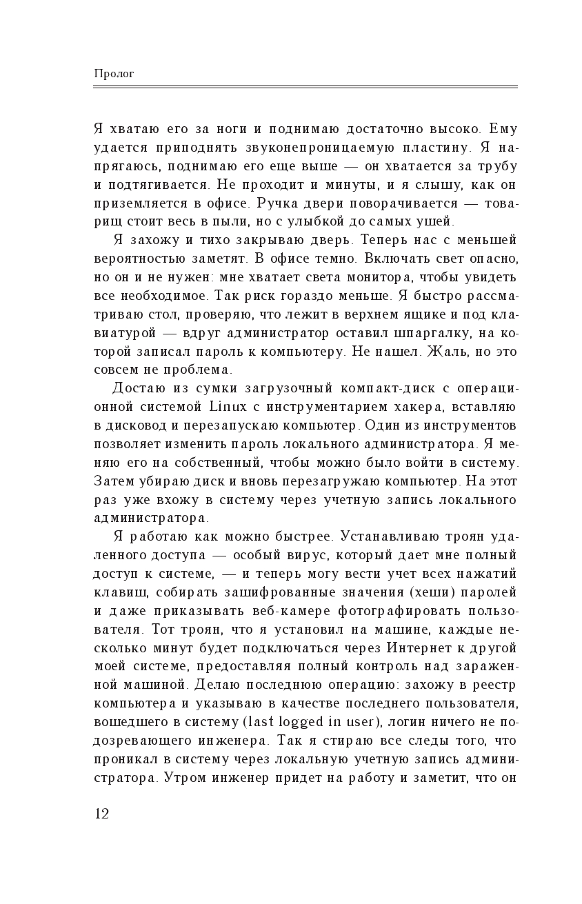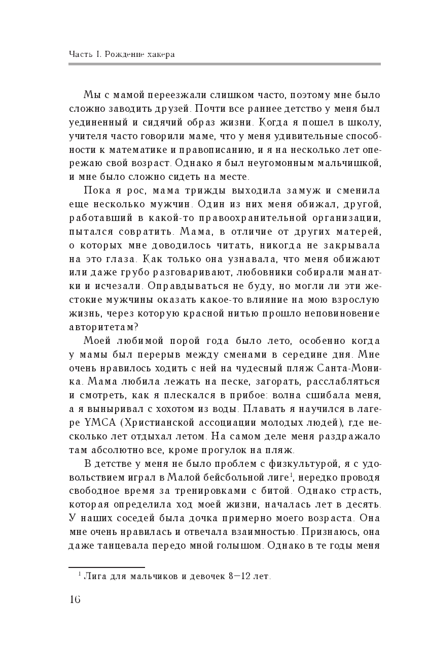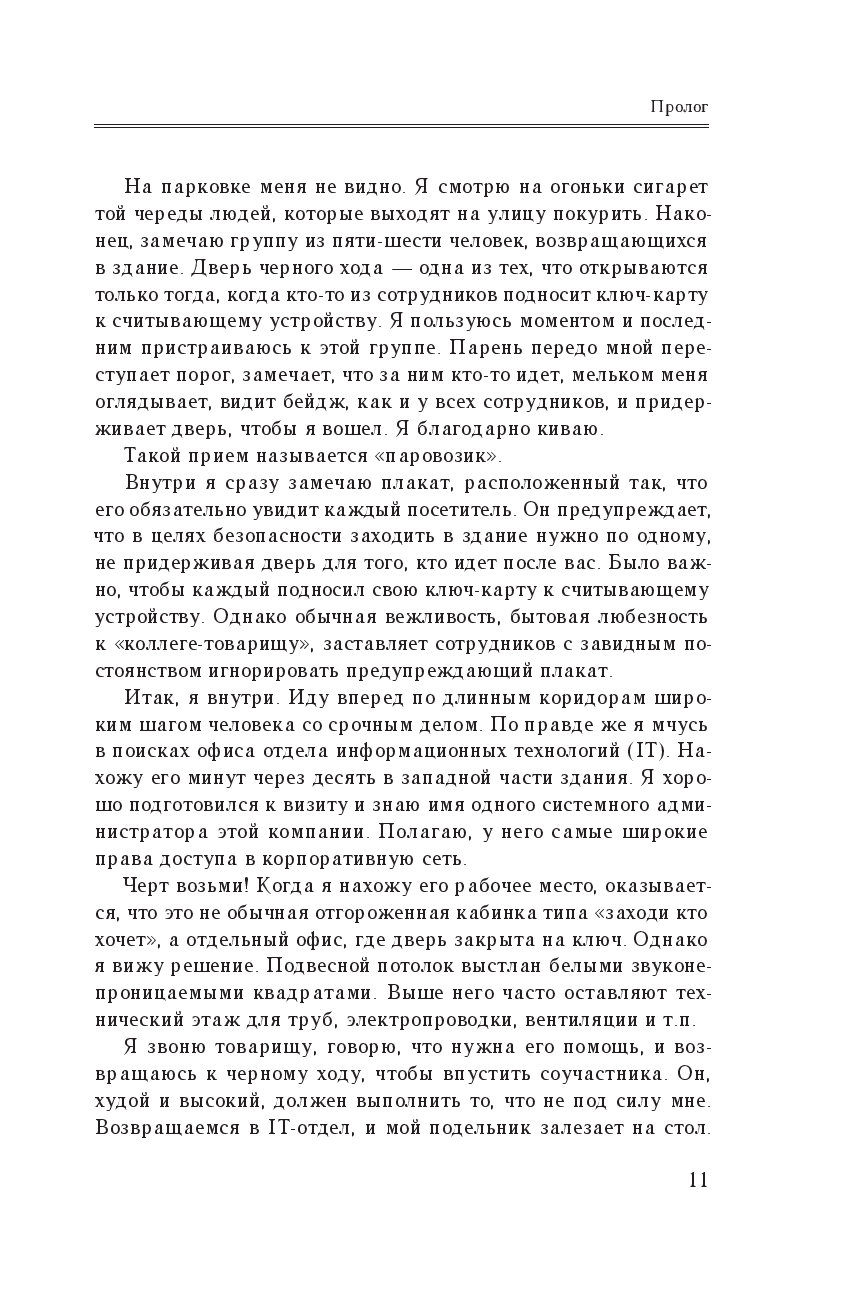 Он долгие годы рыскал по киберпространству, всегда опережая преследователей не на шаг, а на три шага, и заслужил славу человека, которого невозможно остановить. Но для Митника хакерство не сводилось только к технологическим эпизодам – он плел хитроумные сети обмана, проявляя редкое коварство и выпытывая у ничего не подозревающего собеседника ценную информацию.