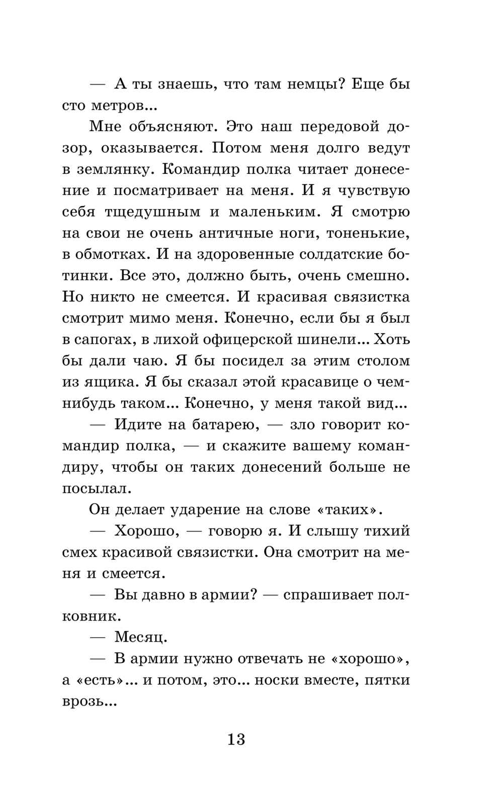 Автор искренне, просто и трогательно рассказывает о том, как по неопытности и глупости принял свист немецких пуль за пение птиц, как долгое время ел щепкой, потому что потерял свою ложку, как быстро научился не замечать холода, голода и усталости. И ещё про то, как очень хотелось нравиться единственной на батарее девушке Нине.
