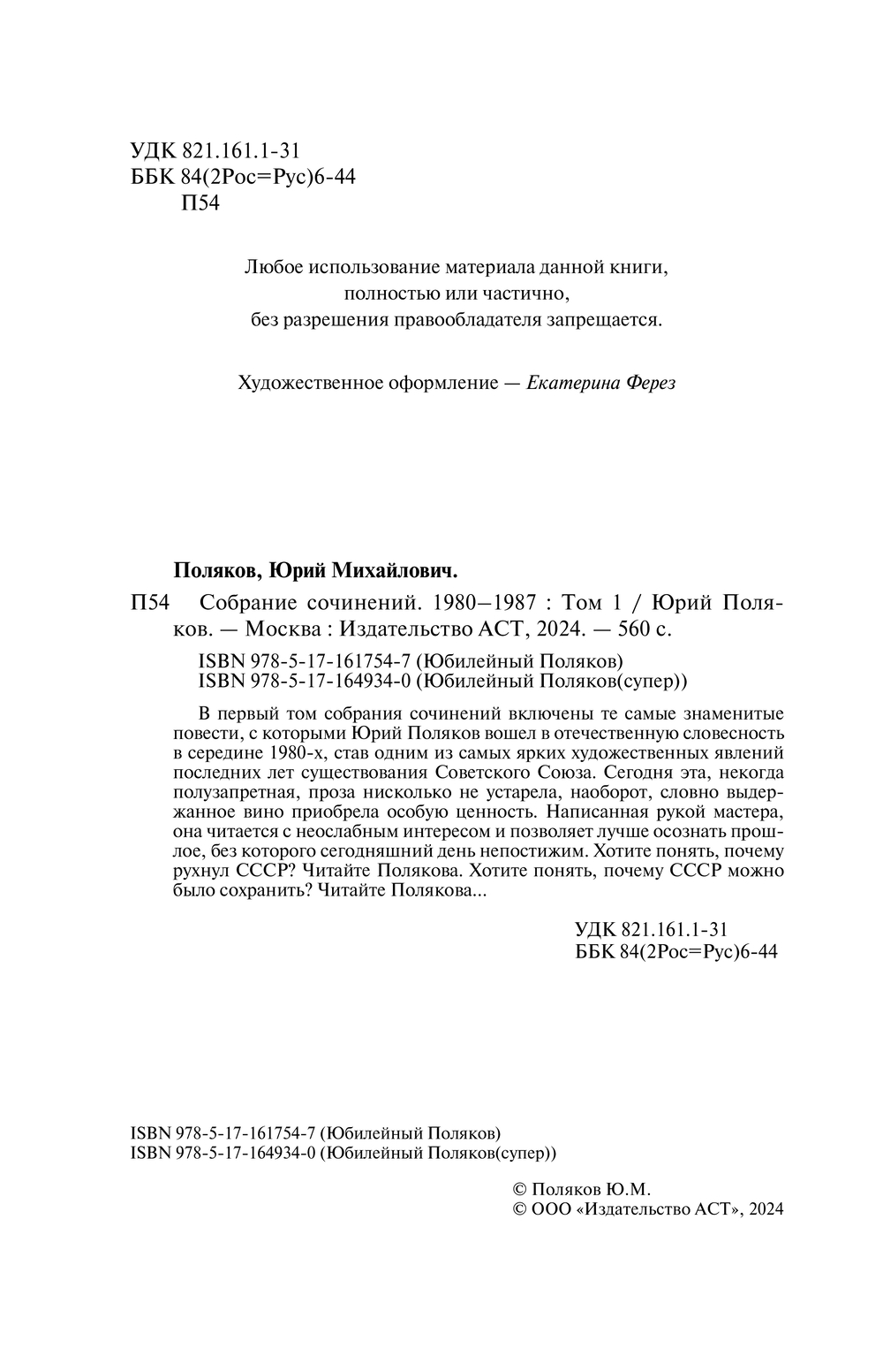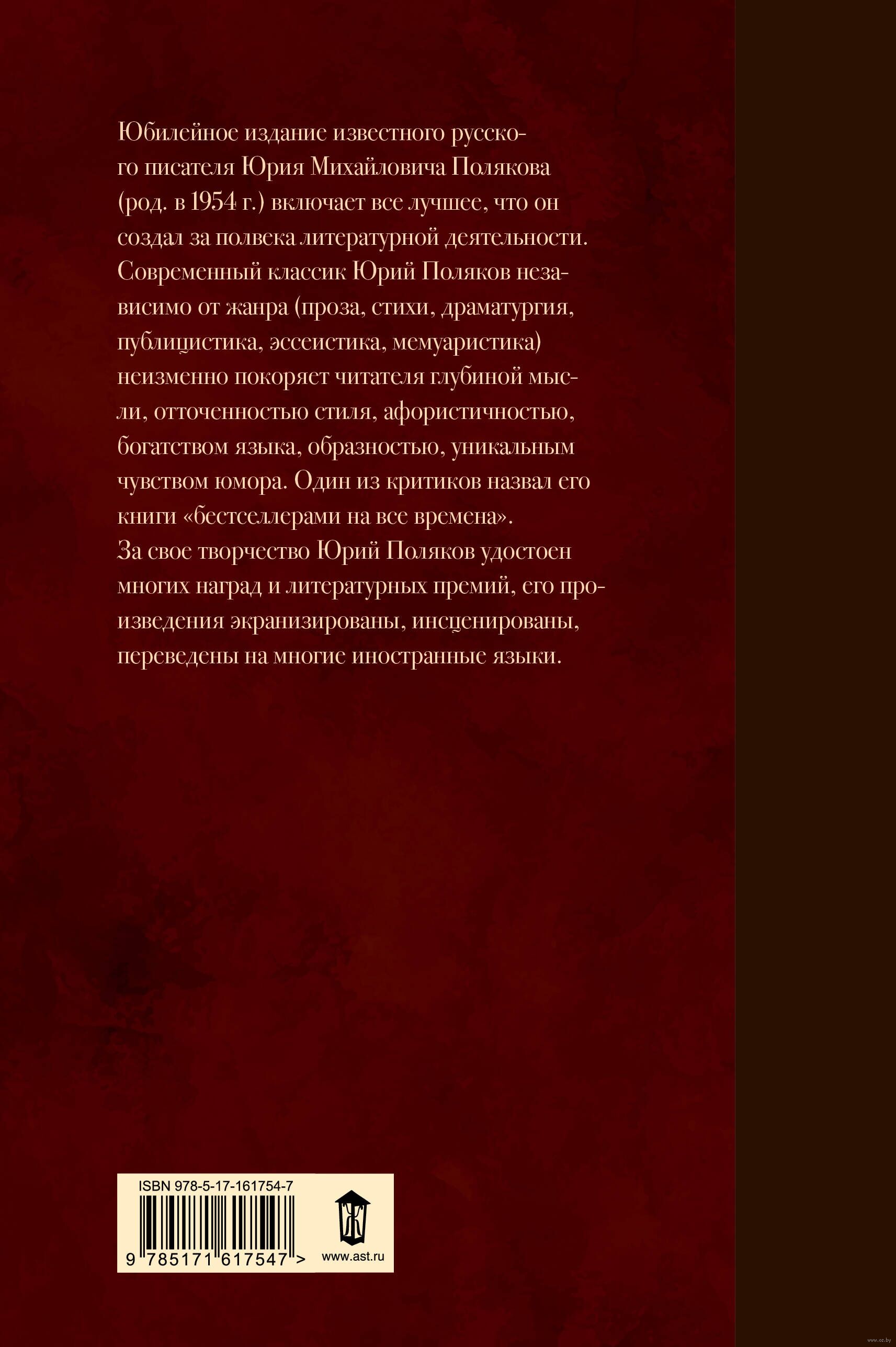 Юбилейное издание известного русского писателя Юрия Михайловича Полякова (род. в 1954 г.) включает все лучшее, что он создал за полвека литературной деятельности. Современный классик Юрий Поляков независимо от жанра (проза, стихи, драматургия, публицистика, эссеистика, мемуаристика) неизменно покоряет читателя глубиной мысли, отточенностью стиля, афористичностью, богатством языка, образностью, уникальным чувством юмора. Один из критиков назвал его книги "бестселлерами на все времена". За свое творчество Юрий Поляков удостоен многих наград и литературных премий, его произведения экранизированы, инсценированы, переведены на многие иностранные языки.