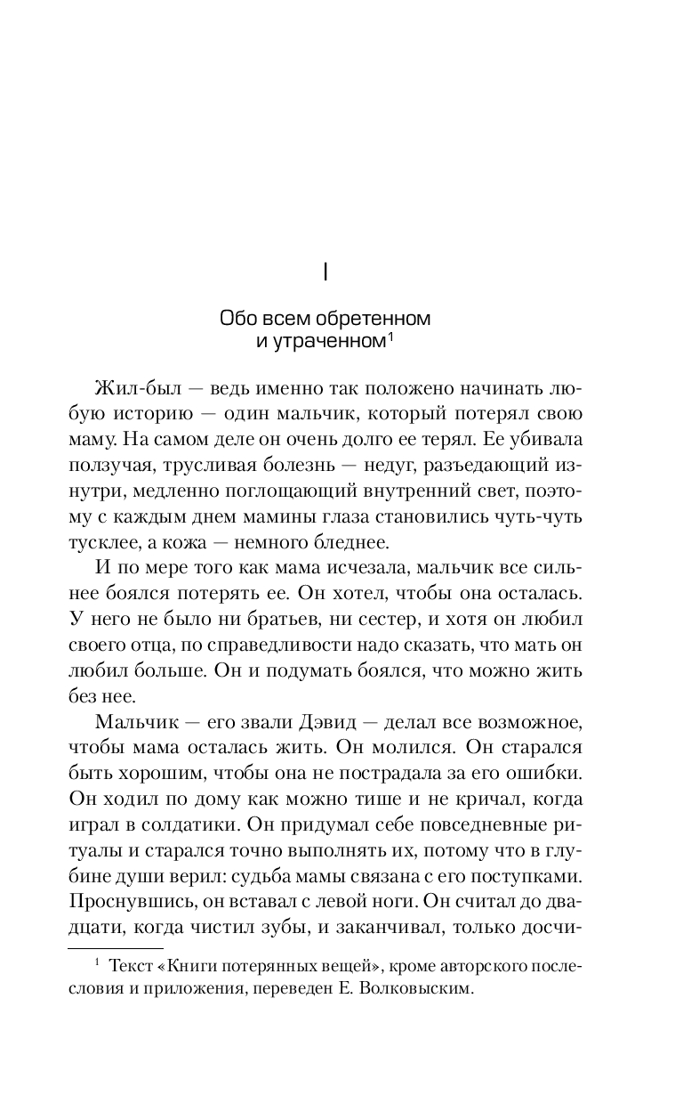 И пока в Европе бушует Вторая мировая война, Дэвид переносится в страну, оказавшуюся странным, пугающе реальным отражением нашего мира. Страну, сплетенную из мифов и историй, населенную волками, похожими на людей, и людьми, которые хуже волков. Страну, где правит увядший король, хранящий свои секреты в легендарной "Книге потерянных вещей"...