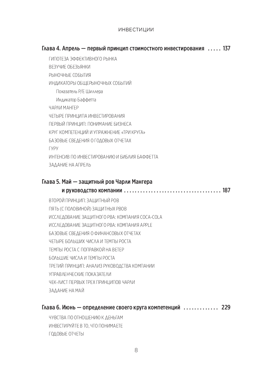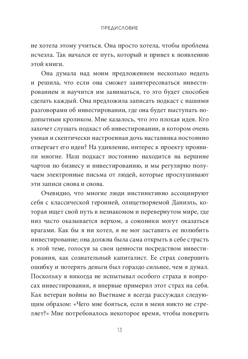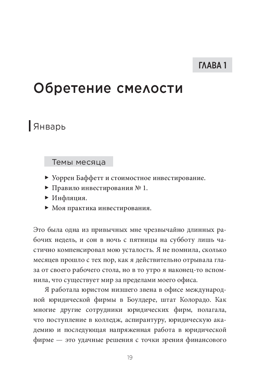 В этой книге Даниэль показывает читателям, как они могут сделать то же самое: взять под контроль свою жизнь и финансы, используя стратегии, которые вывели Уоррена Баффета и Чарли Мангера на вершину Forbes 400. Избегая сложных формул и устаревших финансовых моделей, она превращает знания своего отца-инвесторав 12 пошаговых уроков. Книга не только делает сложный мир инвестирования простым, понятным и доступным, она поможет вам стать более уверенными в себе и составить собственный план достижения финансовой свободы.