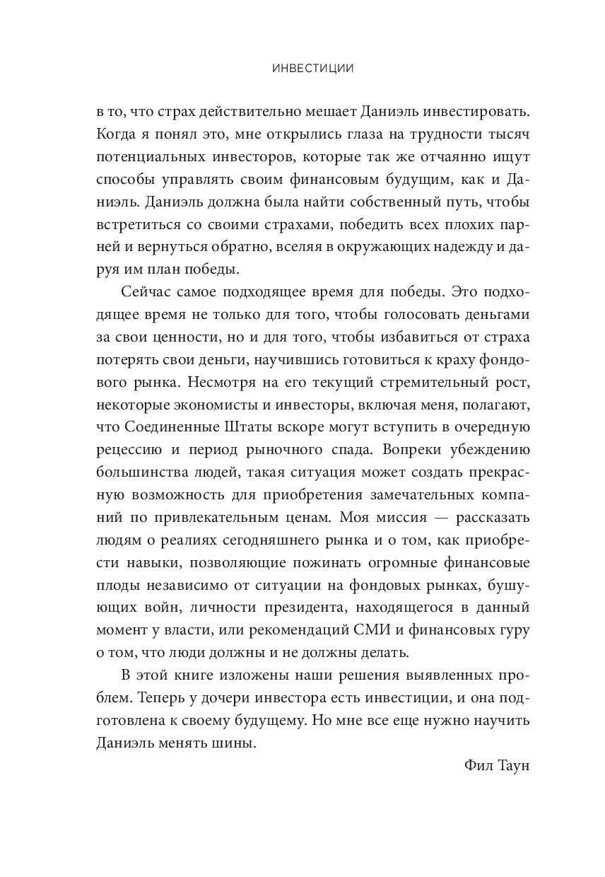 С самого детства слова "финансы", "акции" или "инвестиционный портфель" заставляли Даниэль Таун красноречиво закатывать глаза. Будучи дочерью успешного инвестора и автора финансового бестселлера Фила Тауна, большую часть своей жизни она даже не помышляла об инвестировании, пока в один прекрасный день не почувствовала, что отнимающая все ее время карьера юриста особо не приносит ни денег, ни удовлетворения. Полная решимости взять свое финансовое будущее в собственные руки, девушка отправилась к отцу и попросила рассказать подробнее об инвестировании...