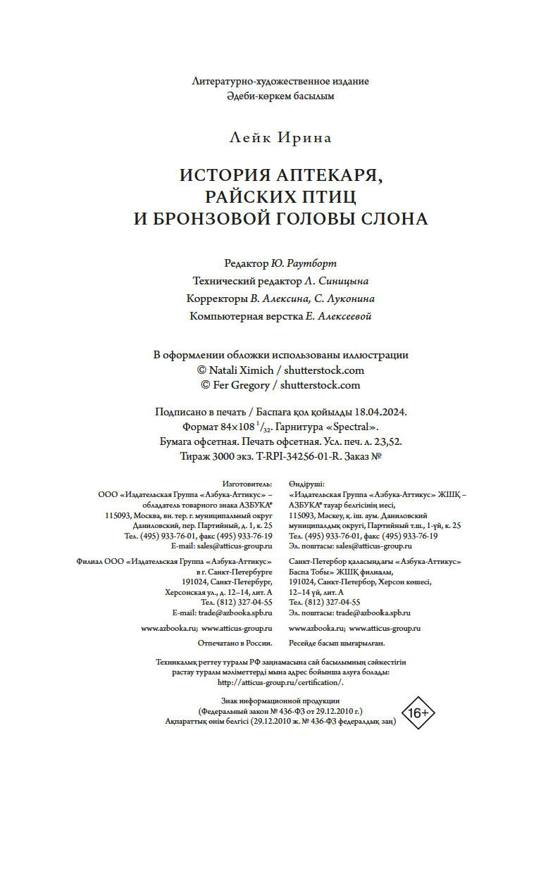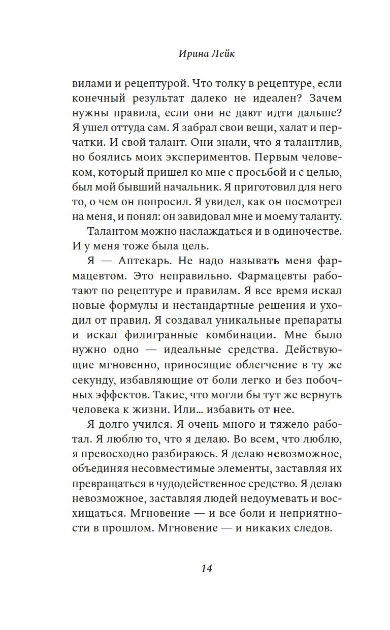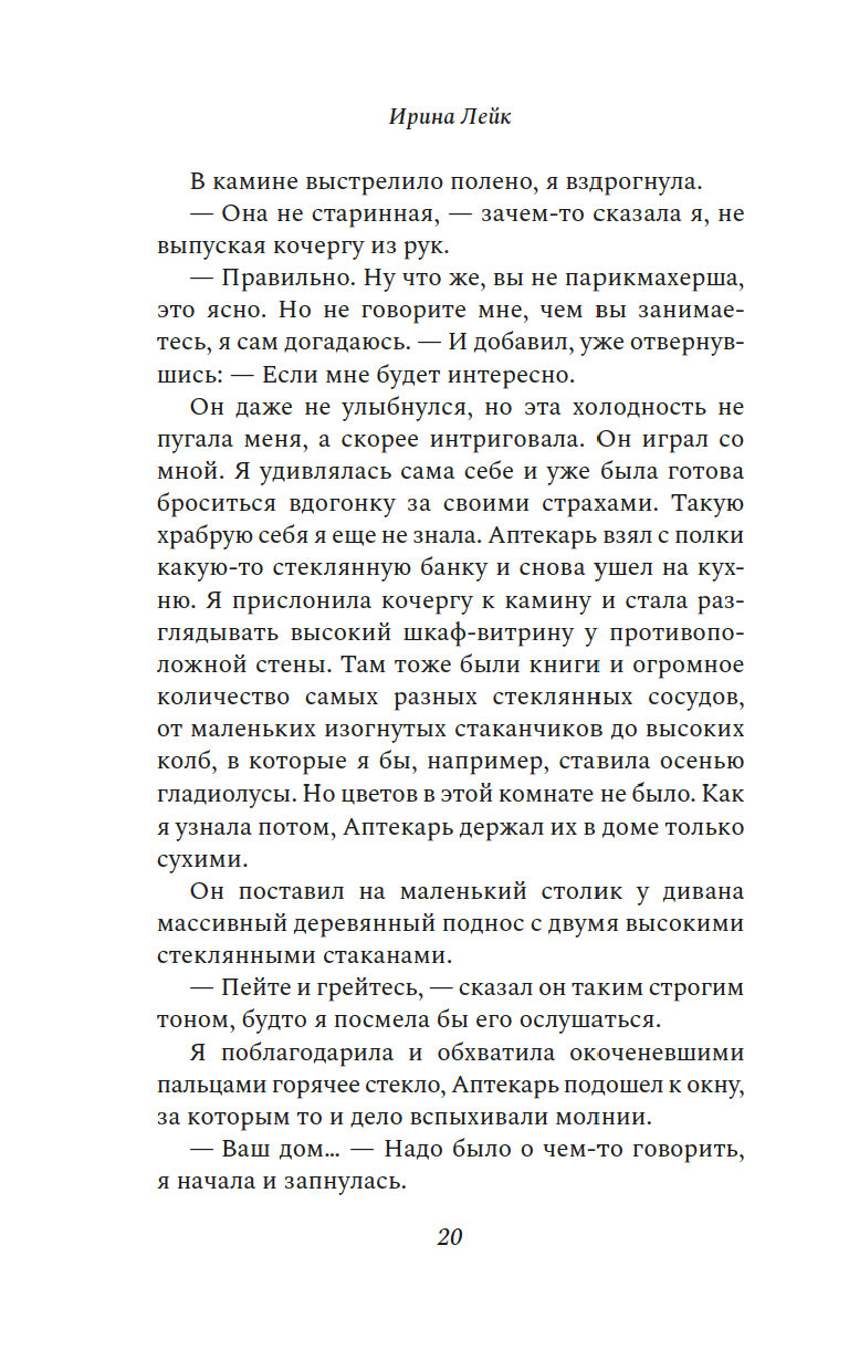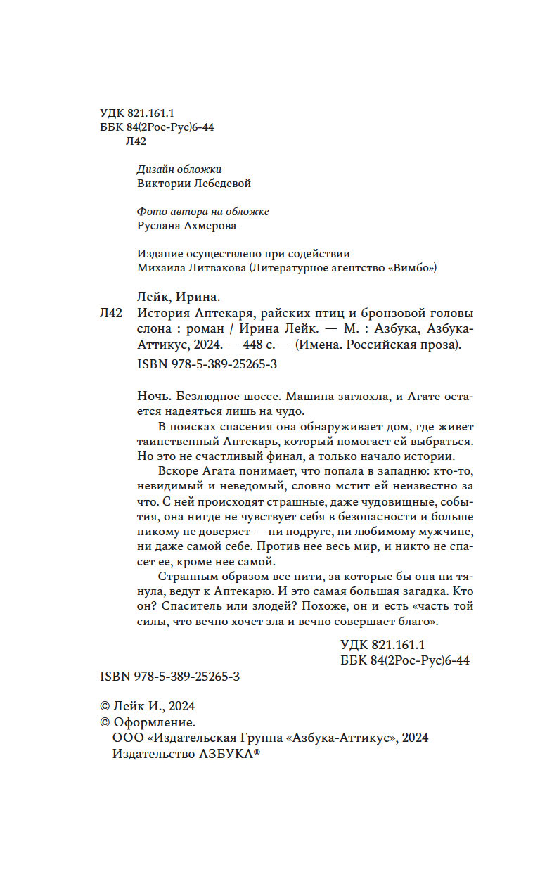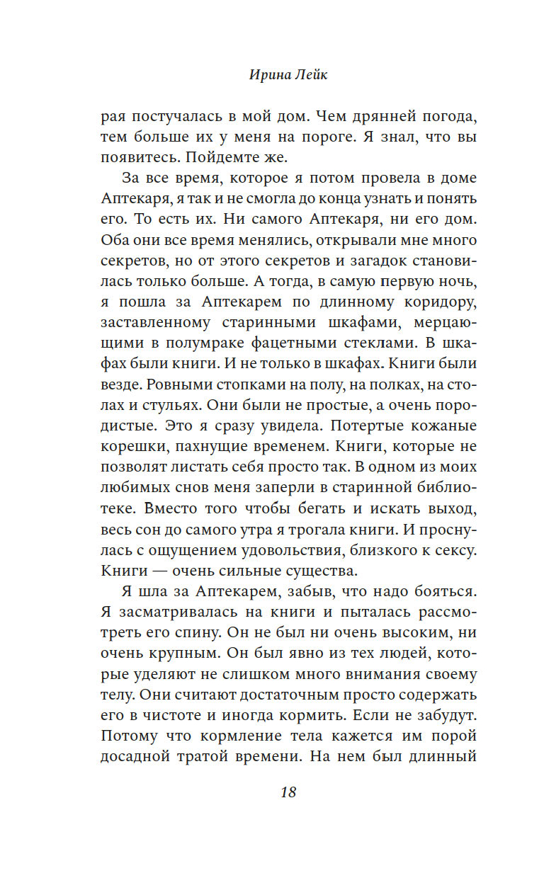 Талантливый человек талантлив во всем. И Ирина Лейк всем своим творчеством подтверждает это. Автор книг, любимых читателями и отмеченных литературными премиями, блистательный переводчик, она мастерски создает романное пространство, в котором читателям невероятно интересно. "История Аптекаря, райских птиц и бронзовой головы слона" – не исключение. Доверьтесь автору, и он проведет вас по лабиринтам истории, которая заставит сопереживать героям, следить, затаив дыхание, за перипетиями сюжета и уж точно не даст ни на минуту заскучать.