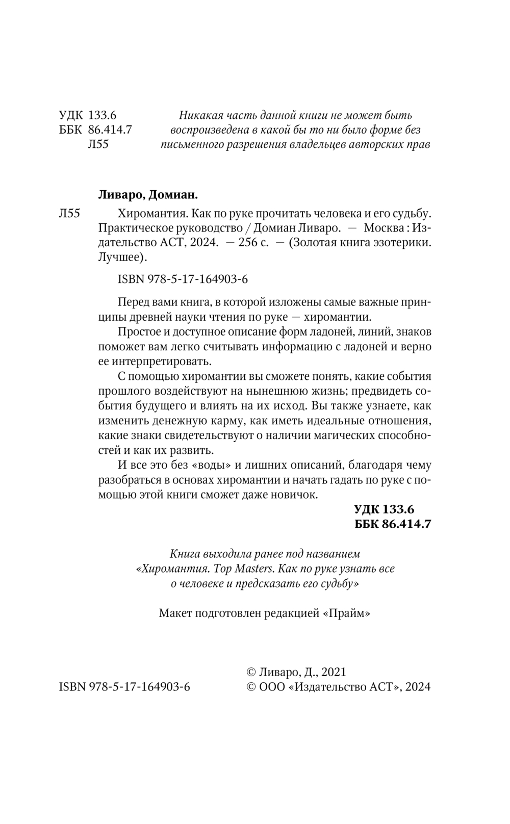 С помощью книги от потомственного хироманта Домиана Ливаро вы научитесь читать людей как открытую книгу. Погрузитесь в тайны этой науки, раскройте ее секреты и узнайте, как понять человека и его судьбу просто по линиям на ладони.
