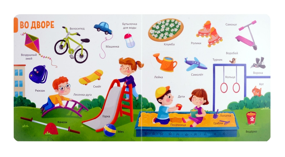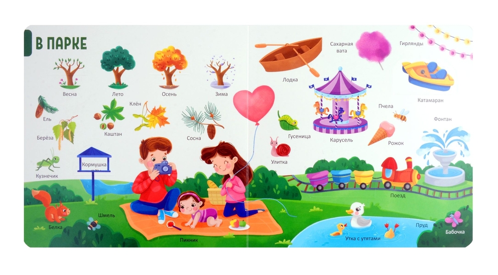 Внутри 6 тематических разворотов с яркими иллюстрациями и окошками: "На прогулке", "В кафе", "Во дворе", "В парке", "В зоопарке", "В магазине".