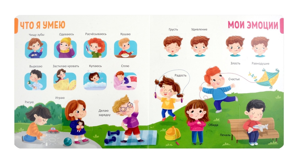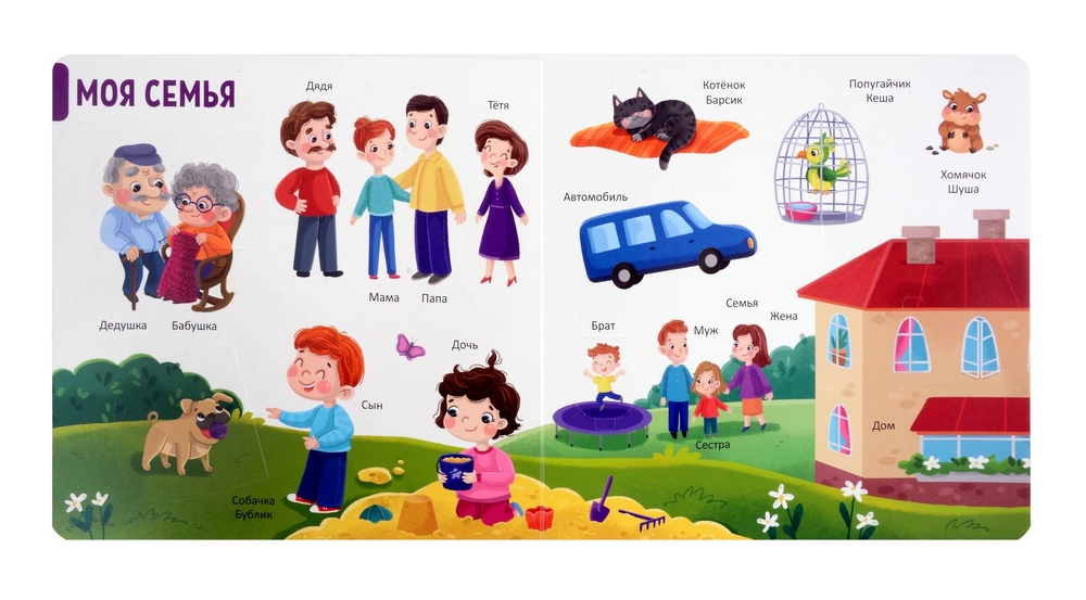 Красочные иллюстрации и интересные окошки помогут запомнить слова и превратят обучение в весёлую игру. А плотные картонные странички и большой формат позволят малышу с комфортом листать и изучать книгу самостоятельно, вовлекая его в процесс.