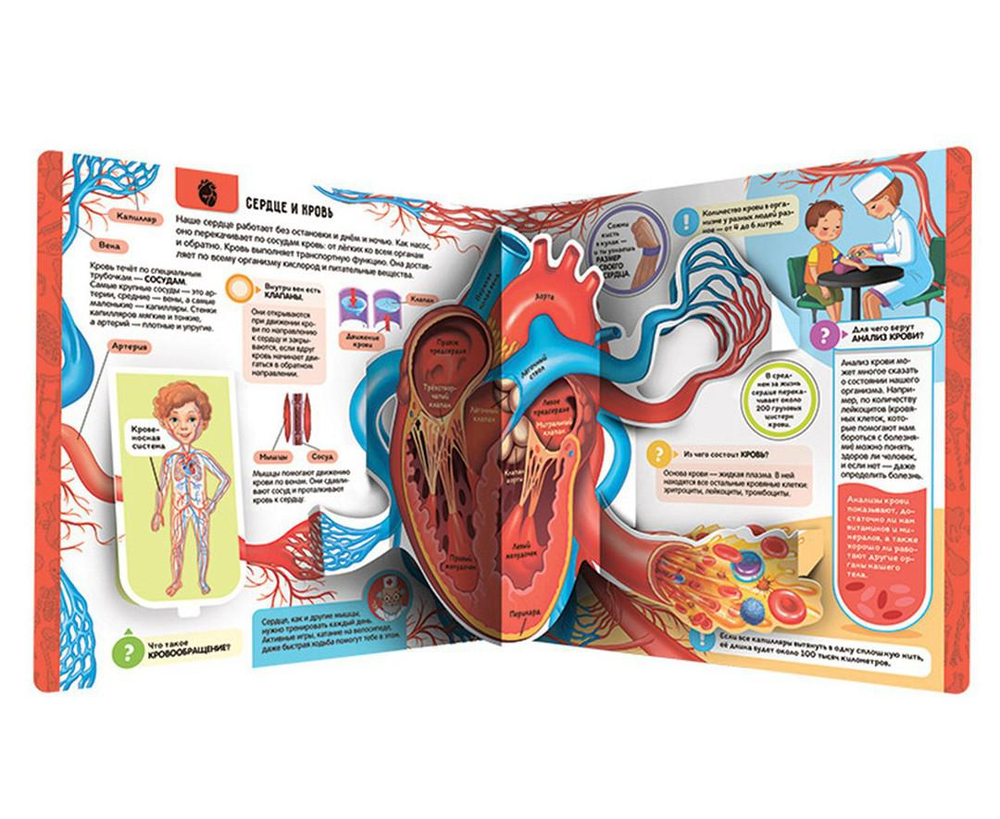 Книга "Анатомия" подробно расскажет вашему малышу об устройстве нашего организма, наглядно продемонстрирует строение сердца и лёгких, пищеварительной и дыхательной системы, объяснит, зачем нужны нервы и почему мы слышим.