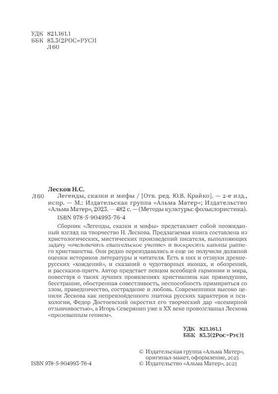 Сборник "Легенды, сказки и мифы" представляет собой неожиданный взгляд на творчество Н. Лескова. Предлагаемая книга составлена из христологических, мистических произведений писателя, выполняющих задачу "очеловечить евангельское учение" и воскресить каноны раннего христианства. Они редко переиздавались и еще не получили должной оценки историков литературы и читателя. Есть в них и отзвуки древнерусских "хождений", и сказаний о чудотворных иконах, и обозрений, и рассказов- притч. Автор предстает певцом всеобщей гармонии и мира, повествуя о таких лучших проявлениях христианина как прямодушие, бесстрашие, обостренная совестливость, неспособность примириться со злом, праведничество, сострадание и любовь. Современники высоко ценили Лескова как непревзойденного знатока русских характеров и психологии, Федор Достоевский окрестил его творческий дар "всемирной отзывчивостью", а Игорь Северянин уже в XX веке провозглашал Лескова "прозеванным гением".