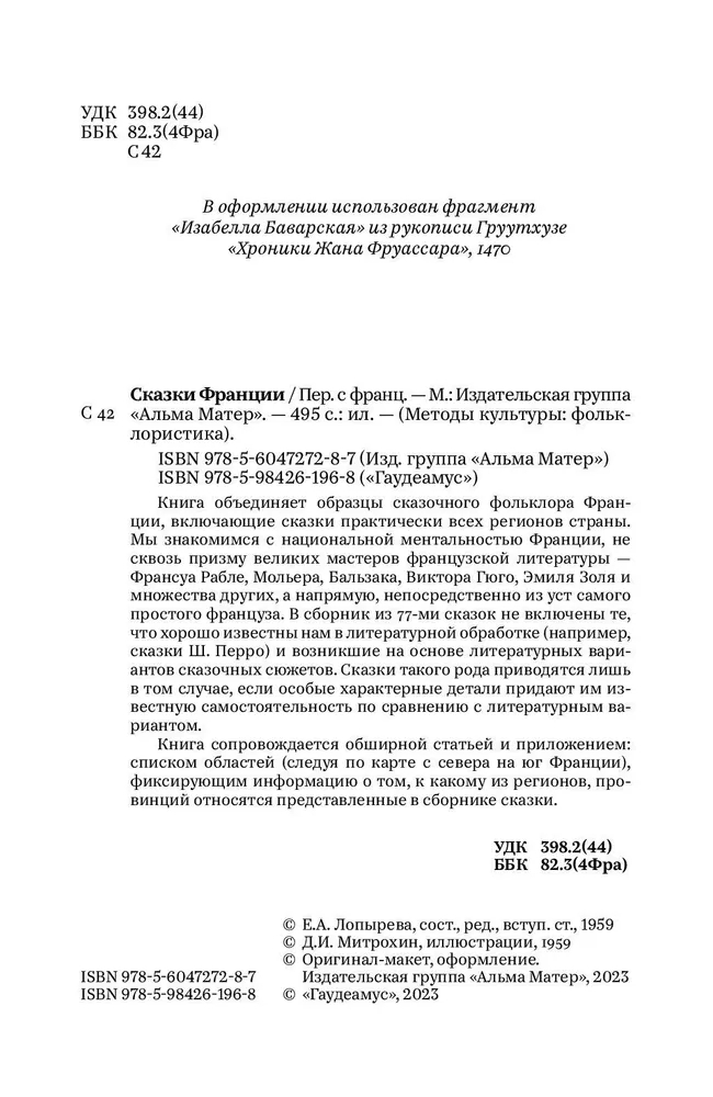 Книга объединяет образцы сказочного фольклора Франции, включающие сказки практически всех регионов страны. Мы знакомимся с национальной ментальностью Франции, не сквозь призму великих мастеров французской литературы – Франсуа Рабле, Мольера, Бальзака, Виктора Гюго, Эмиля Золя и множества других, а напрямую, непосредственно из уст самого простого француза. В сборник из 77-ми сказок не включены те, что хорошо известны нам в литературной обработке (например, сказки Ш. Перро) и возникшие на основе литературных вариантов сказочных сюжетов. Сказки такого рода приводятся лишь в том случае, если особые характерные детали придают им известную самостоятельность по сравнению с литературным вариантом.