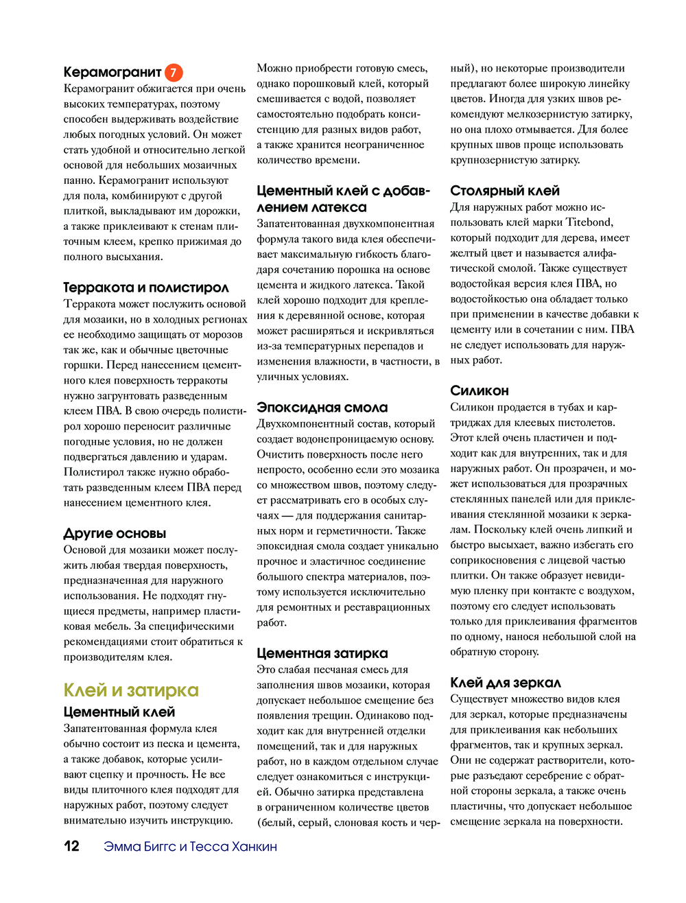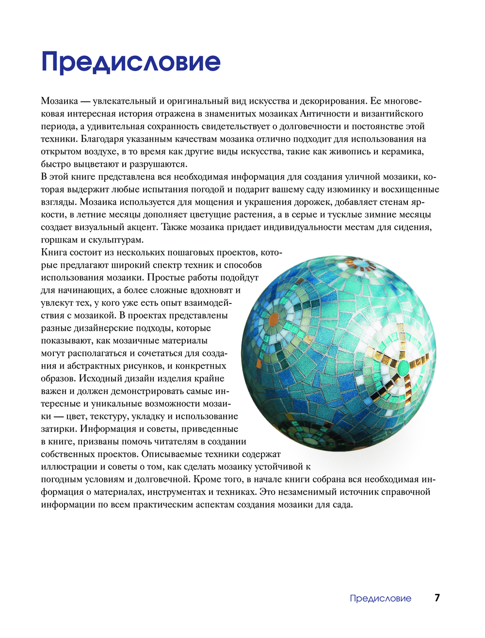 Мозаика – очень оригинальный вид искусства. Она долговечна, поэтому хорошо подходит для декорирования в саду, на открытом воздухе. В этой книге представлены 19 различных пошаговых проектов разной степени сложности, которые смогут воплотить в жизнь как начинающие, так и те, у кого уже есть опыт работы с мозаикой. Вы узнаете о различных дизайнерских подходах, мозаичных материалах и их сочетаниях, а также о цвете, текстуре и укладке. Представленная информация и советы помогут вам создать свой собственный садовый мозаичный проект.