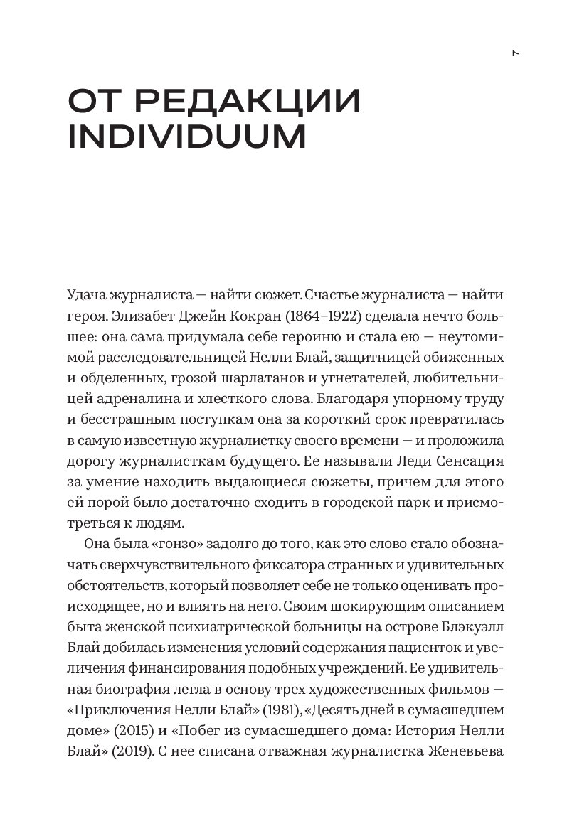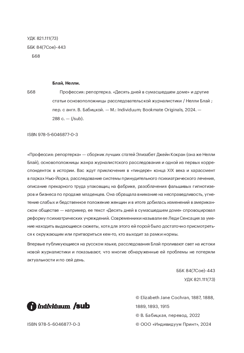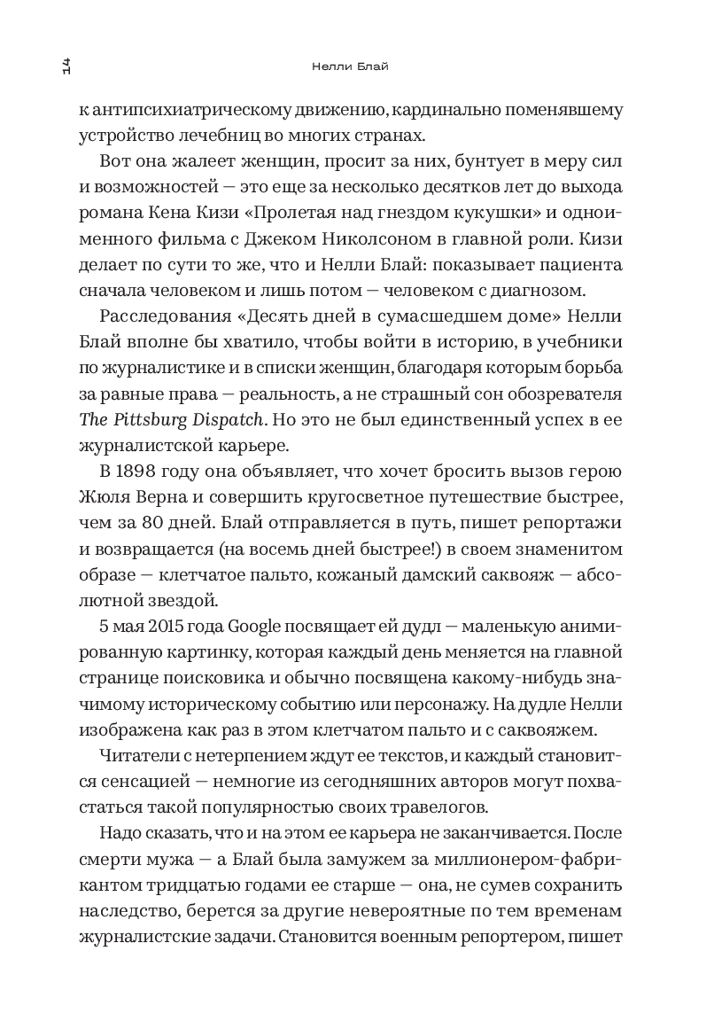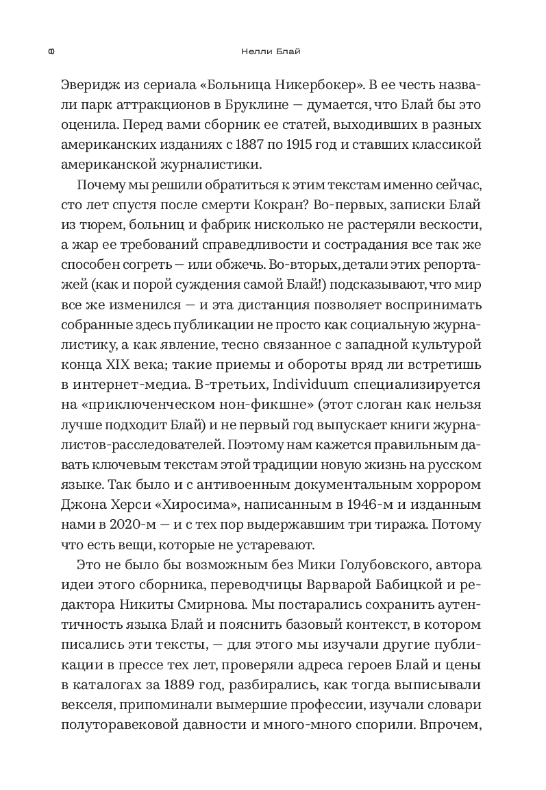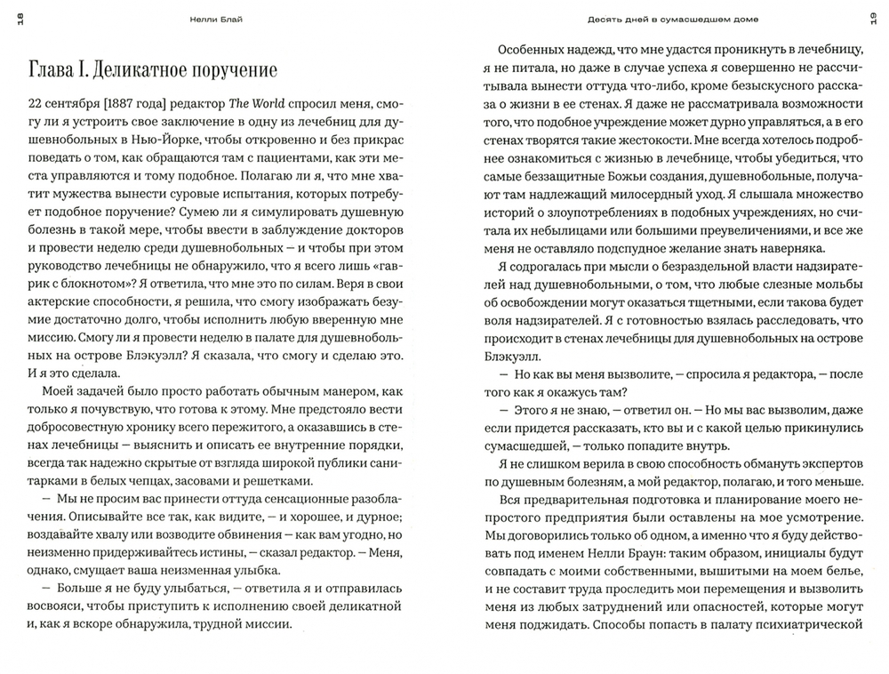 Впервые публикующиеся на русском языке расследования Блай проливают свет на истоки новой журналистики и показывают, что многие обнаруженные ей проблемы не потеряли актуальности и по сей день.