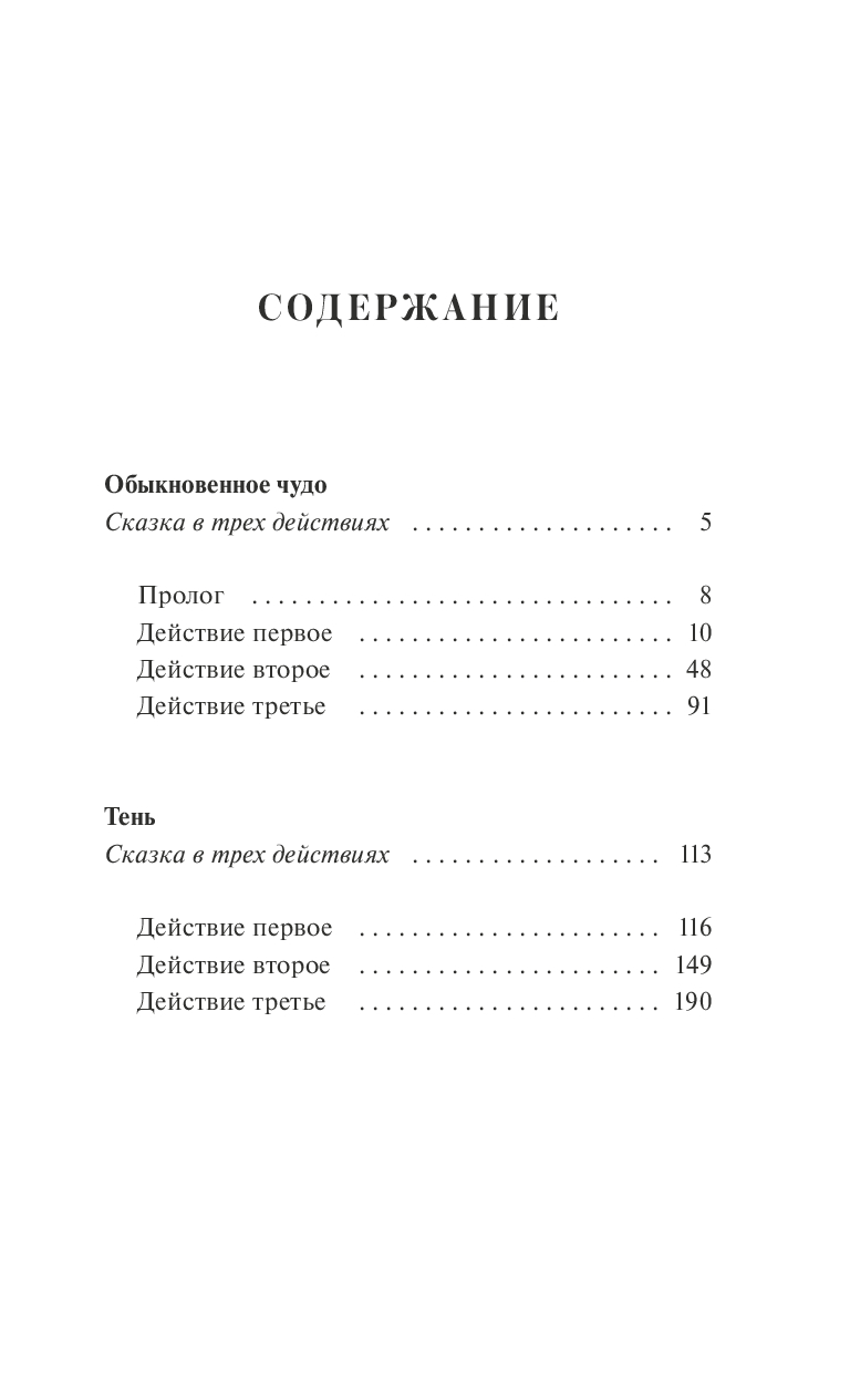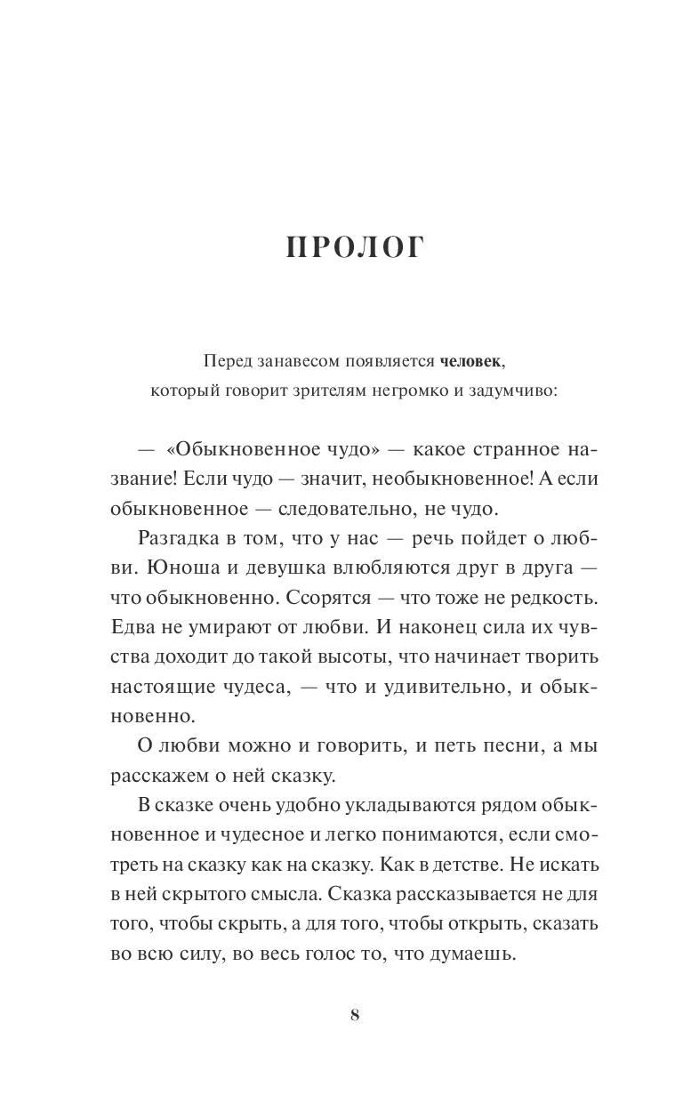 Две пьесы-сказки Евгения Шварца – "Обыкновенное чудо" (1954) и "Тень" (1940) – под одной обложкой. Режиссер Ленинградского театра комедии Н. П. Акимов писал: "У пьес Евгения Шварца такая же судьба, как у цветов, морского прибоя и других даров природы: их любят все, независимо от возраста".