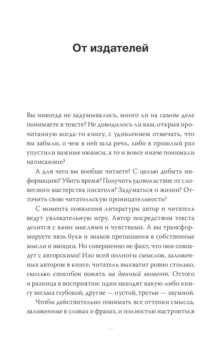 Почему одни находят какую-либо книгу весьма глубокой, другие – пустой, третьи – заумной? Почему, перечитывая книгу, вы каждый раз обнаруживаете что-то не замеченное ранее? Почему кто-то понимает все оттенки смысла, видит сокрытое между строк, слышит музыку слов, чувствует их вкус, цвет и запах, а кто-то остается глух к ним?
