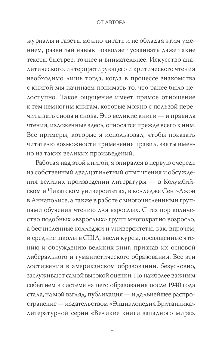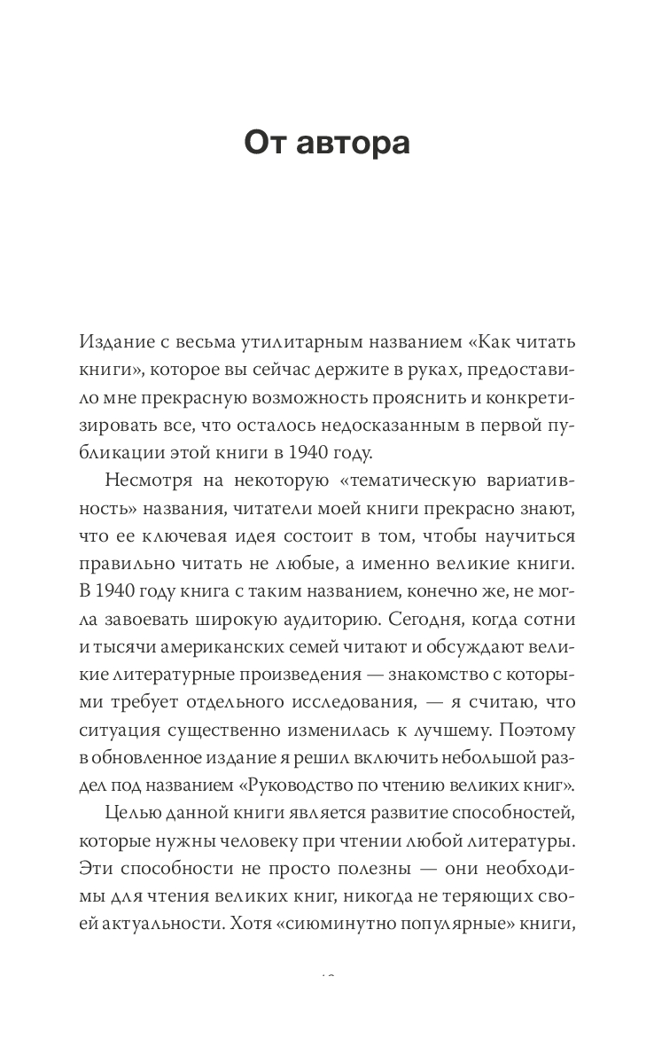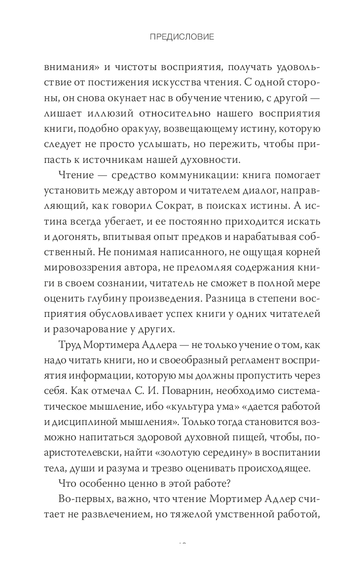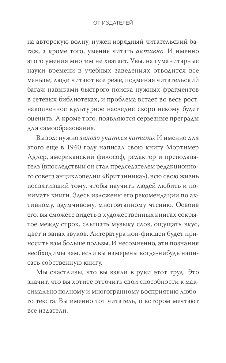 Чтобы настроиться на «волну» автора и понимать больше, требуется умение читать активно. Именно для этого написал свою книгу Мортимер Адлер, американский философ, редактор и преподаватель, всю свою жизнь посвятивший тому, чтобы научить людей любить и понимать книги (впоследствии он возглавил редакционный совет энциклопедии "Британника").