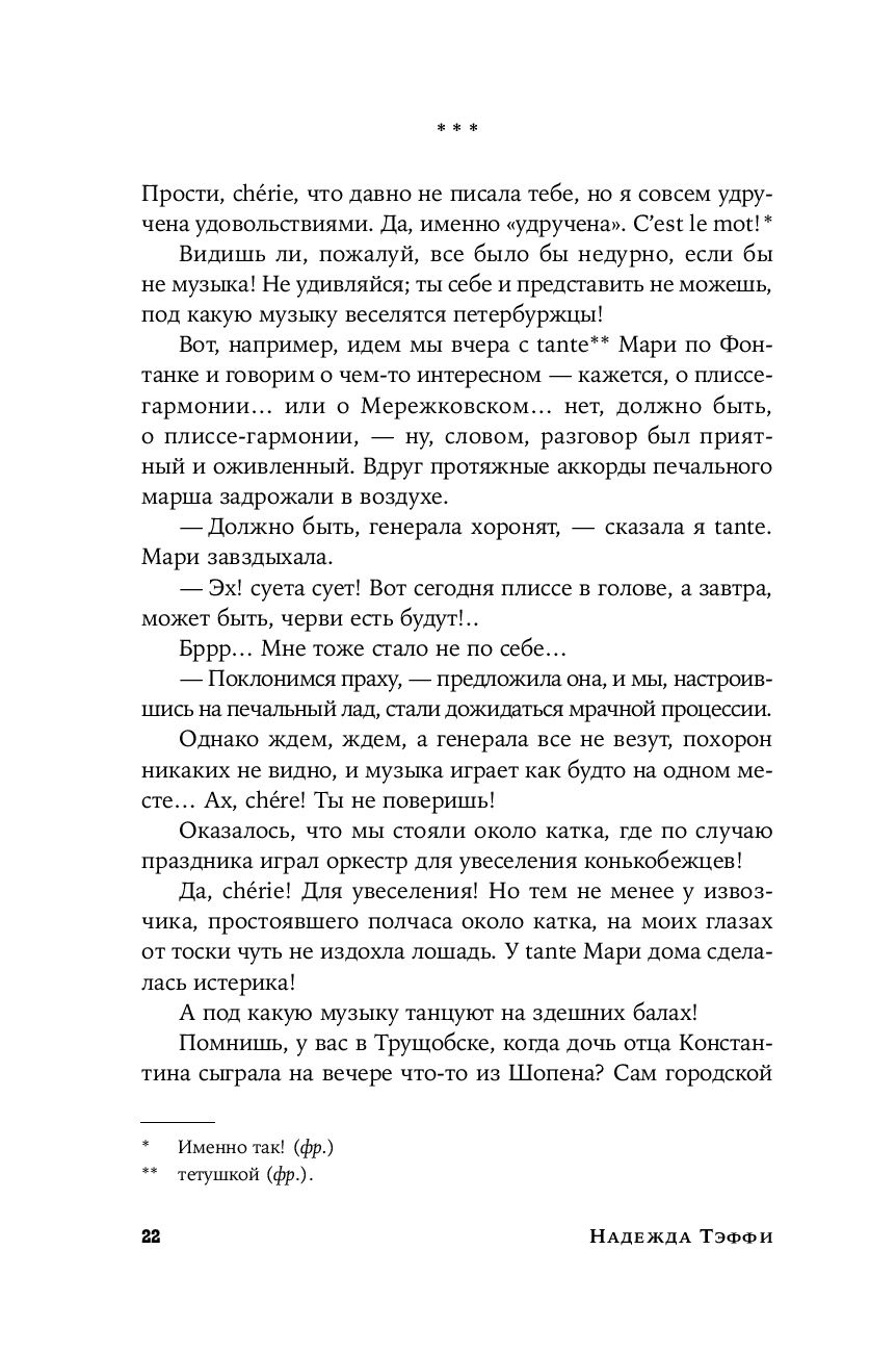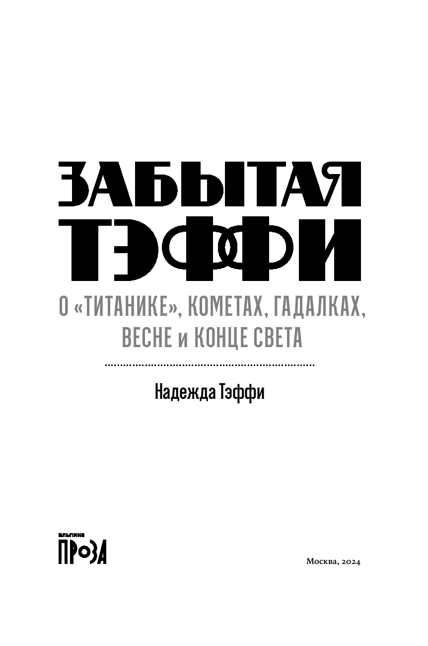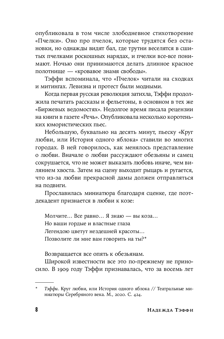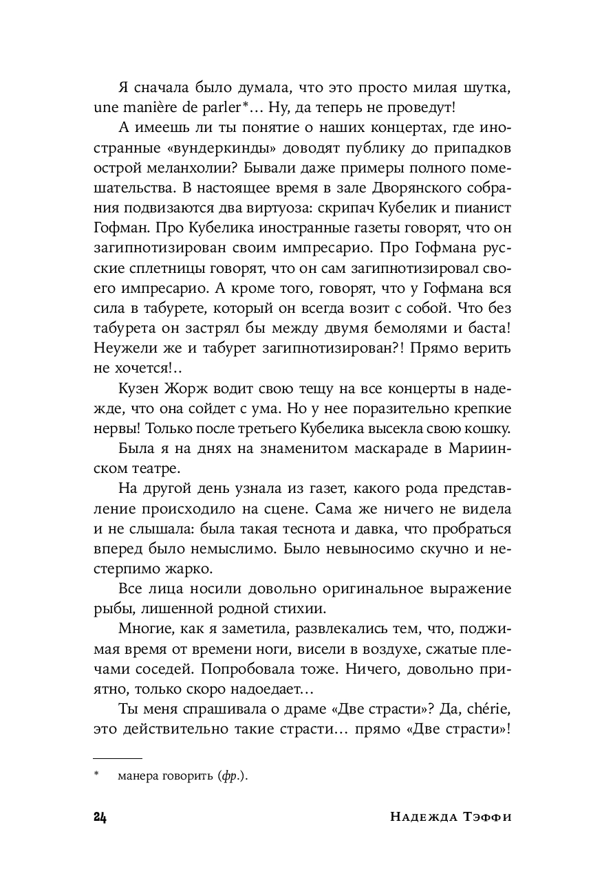 Тем временем ее дореволюционные фельетоны долго оставались в тени. И вот наконец они впервые публикуются под одной обложкой. Эти блестяще написанные, полные тонких наблюдений и точных оценок заметки о российской повседневности образца начала ХХ века удивительным образом перекликаются с современностью – столько общего у нас с героями Тэффи, таким живым и пластичным языком написаны ее истории.