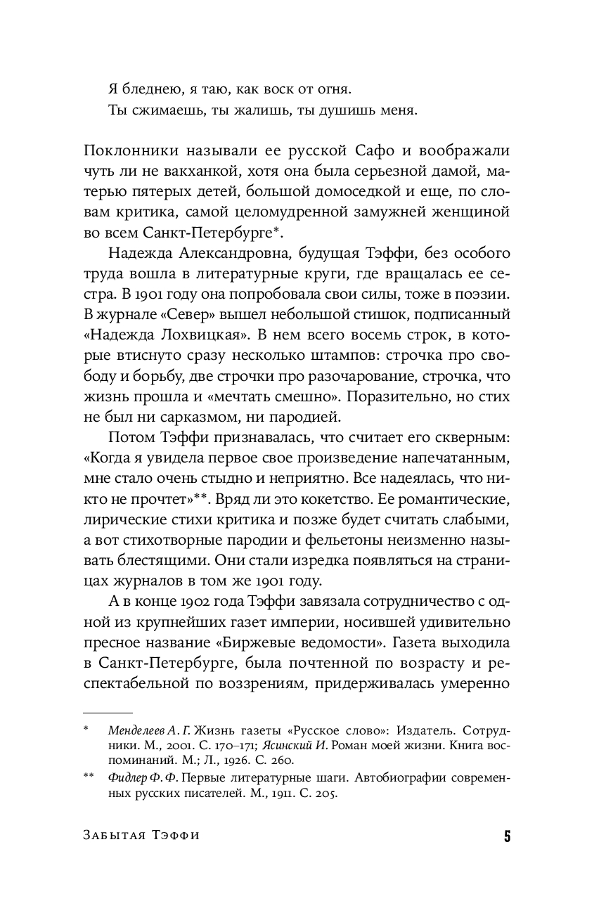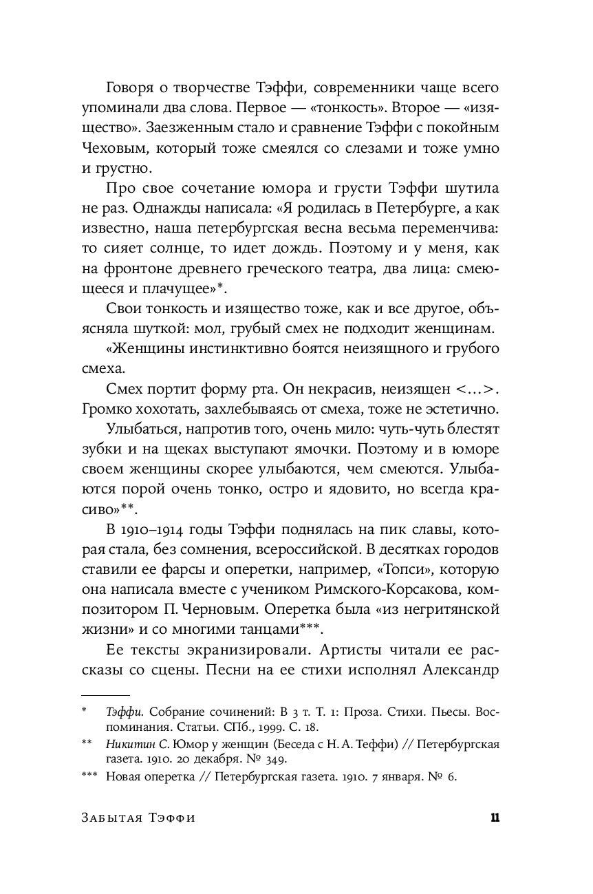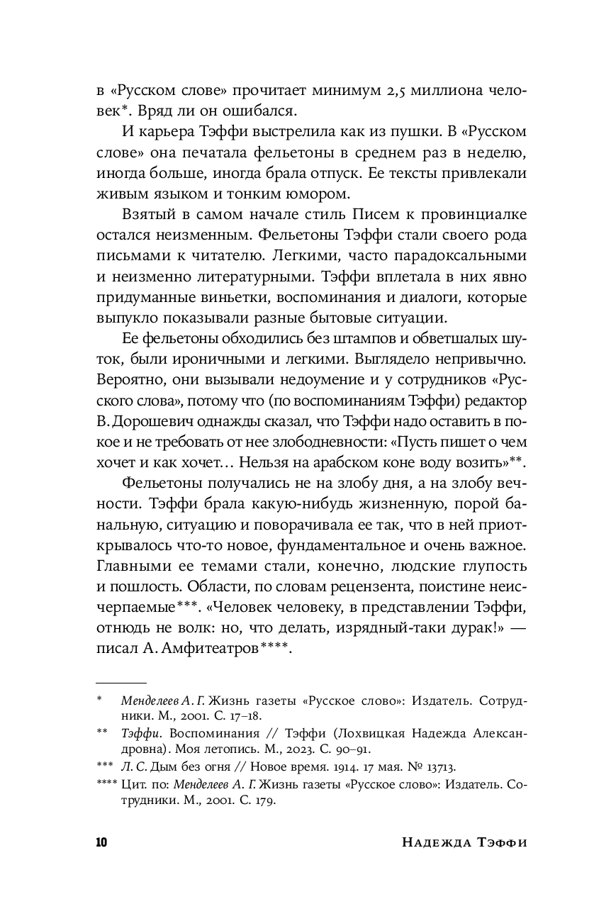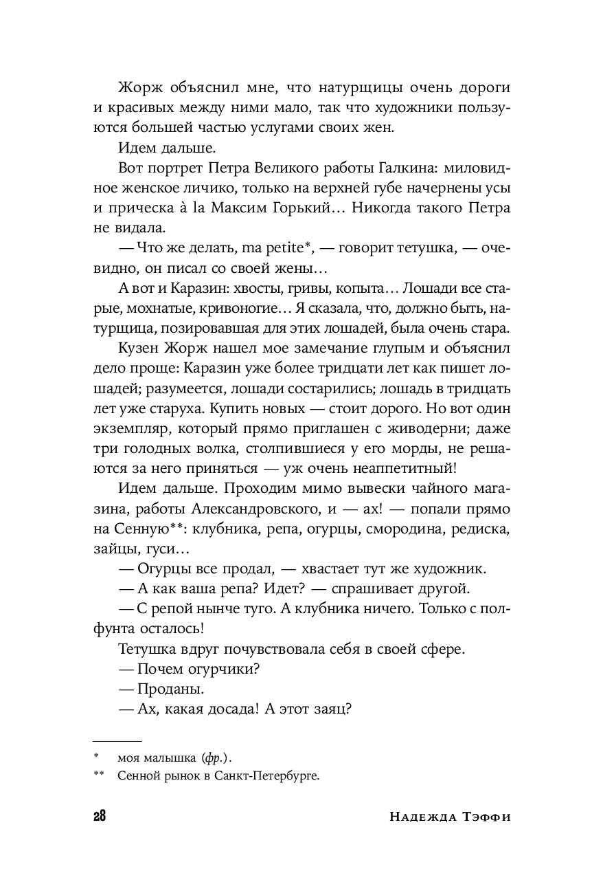 Тем временем ее дореволюционные фельетоны долго оставались в тени. И вот наконец они впервые публикуются под одной обложкой. Эти блестяще написанные, полные тонких наблюдений и точных оценок заметки о российской повседневности образца начала ХХ века удивительным образом перекликаются с современностью – столько общего у нас с героями Тэффи, таким живым и пластичным языком написаны ее истории.