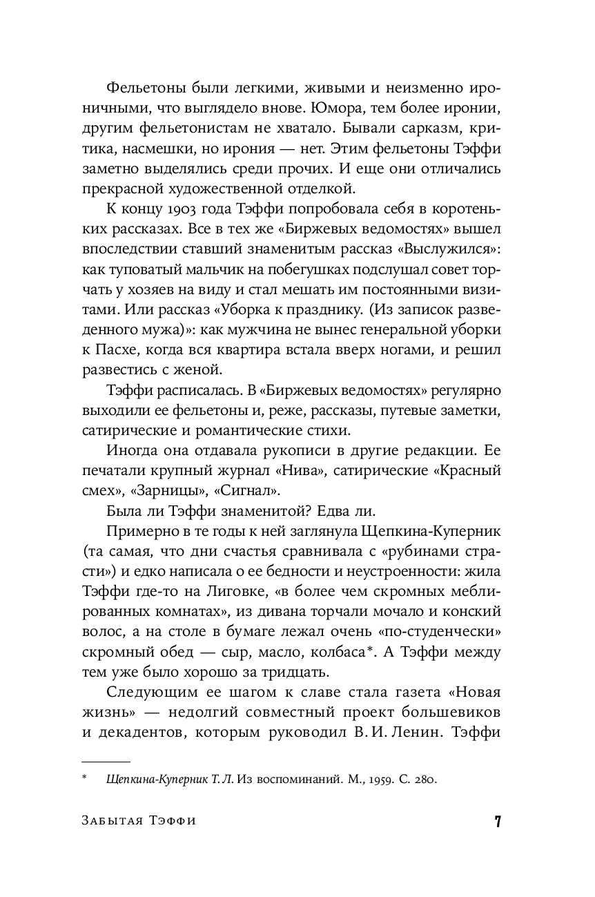 Изящные, ироничные, а порой и ехидные рассказы Надежды Лохвицкой, более 100 лет назад прославившейся как Тэффи, регулярно переиздаются с 1990-х. Но в основном это ранняя юмористическая или лиричная эмигрантская проза.