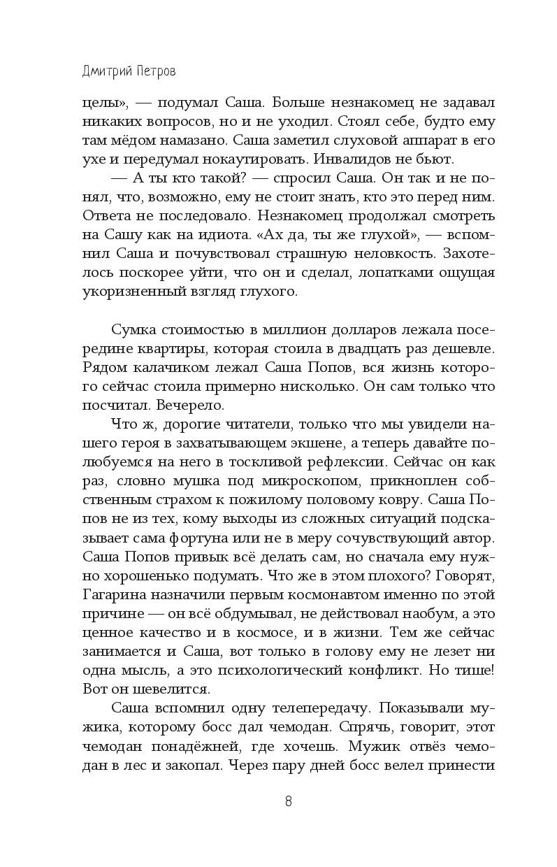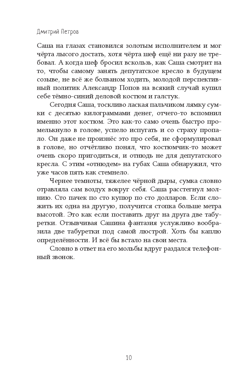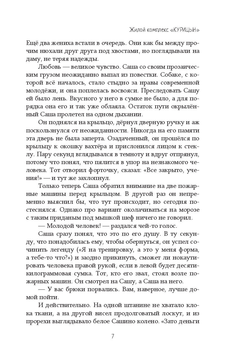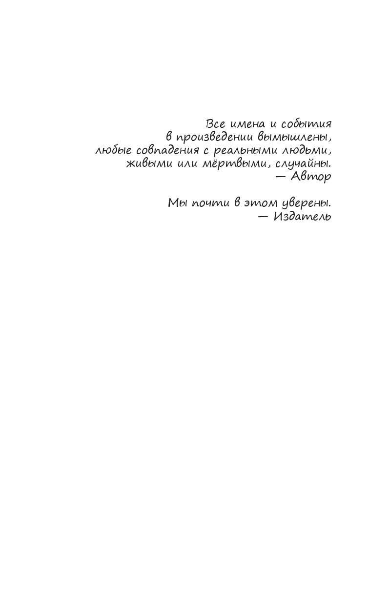 Все имена и события вымышлены, любые совпадения случайны. Автор ни разу не указывает, где происходит действие, но читатели угадывают свой город безошибочно.