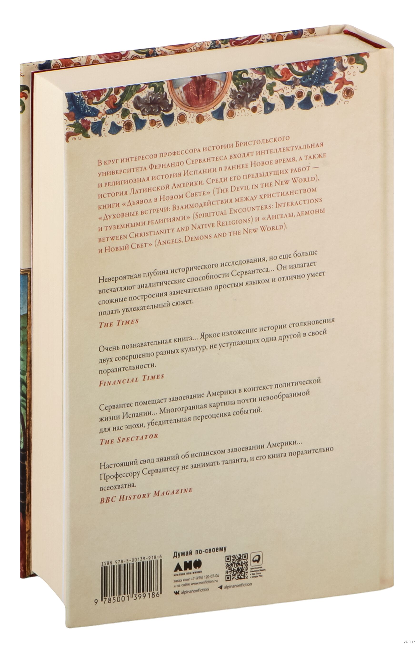 Мексиканский историк Фернандо Сервантес, сам прямой потомок одного конкистадоров, поставил своей целью разглядеть за штампами и мифами об испанской колонизации этот реальный контекст, без которого тогдашний мир почти непостижим с расстояния в 500 с лишним лет. Анализируя дневники, письма, хроники и первые в истории правозащитные трактаты, он старается отделить факты от саморекламы, желания оклеветать конкурентов, попыток добиться от королевского двора определенных политических решений и многовековых усилий иностранных – прежде всего голландских и английских – авторов представить испанцев в максимально невыгодном свете. Эта книга и заставляет задуматься о том, как пишется история, и проливает совершенно новый свет на события, превратившее личную унию небольших европейских монархий в одну из величайших империй всех времен.