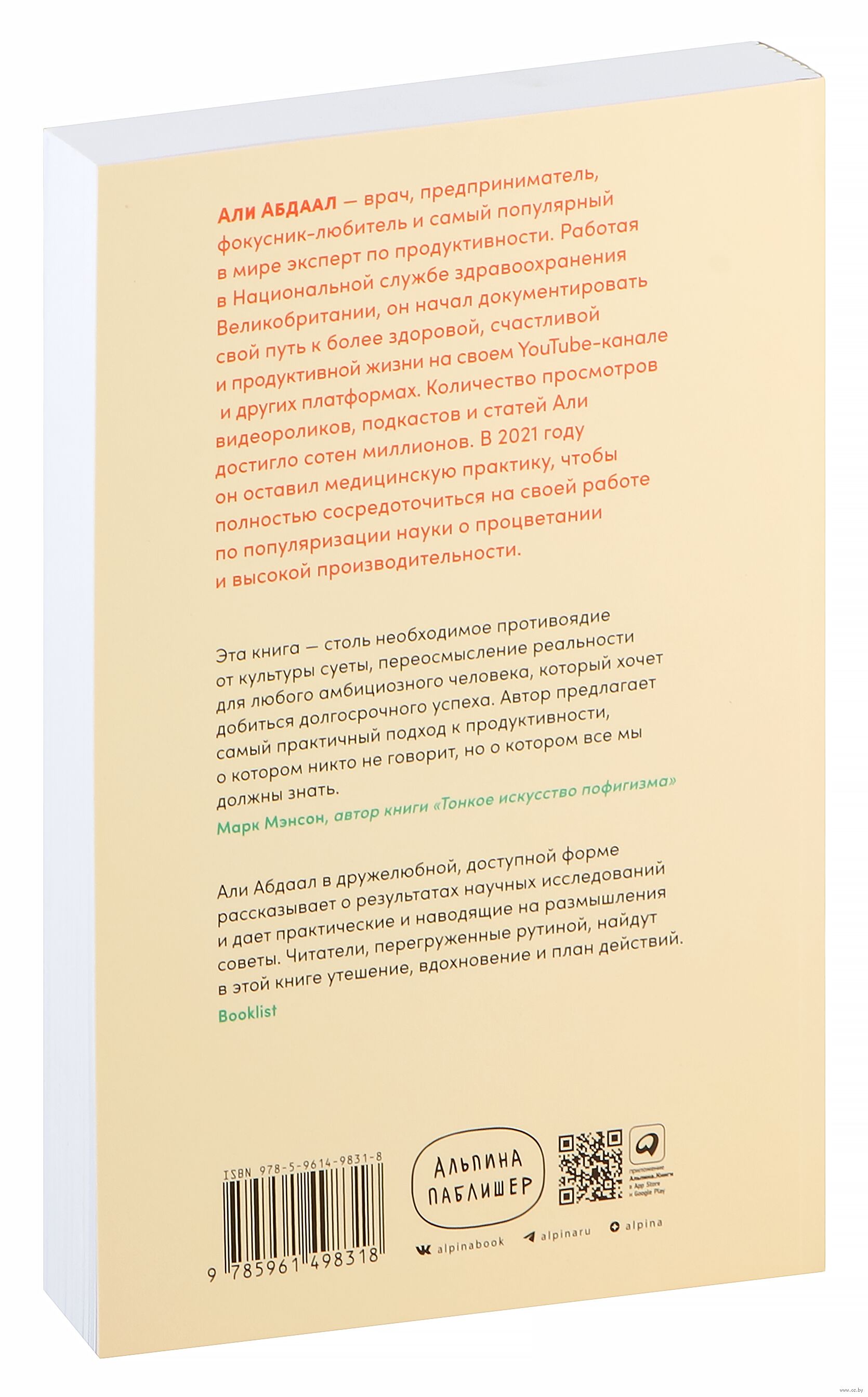 Али Абдаал, бывший врач, ныне успешный блогер и предприниматель, приглашает читателя в мир позитивной продуктивности, где каждый день искрится вдохновением и приносит радость, где достаточно времени и пространства на всё, где каждое действие доставляет удовольствие и приближает к заветной мечте, где цели достигаются без насилия над собой, а текущие задачи выполняются легко и непринужденно. Мир, где вы можете быть продуктивными и счастливыми одновременно.