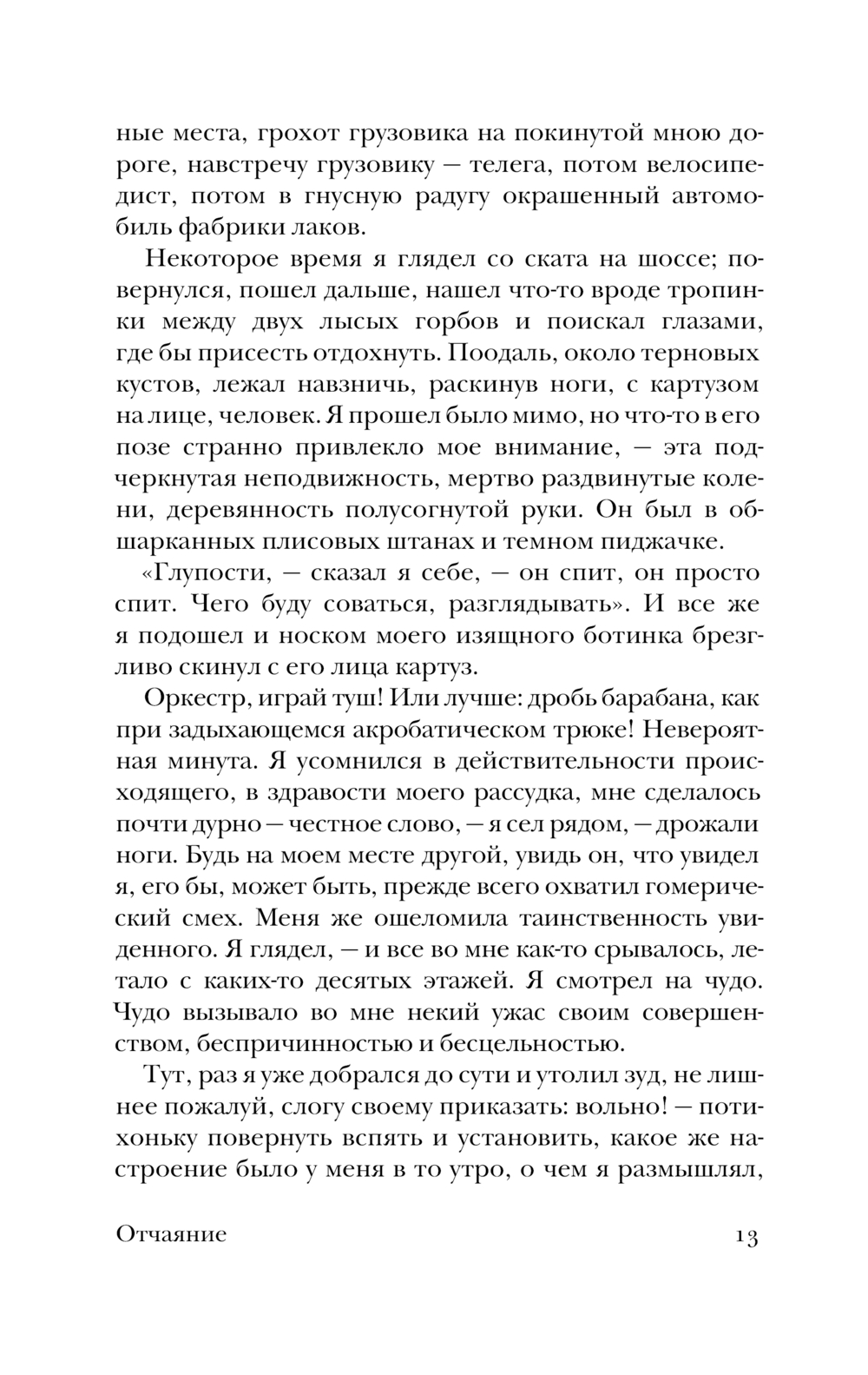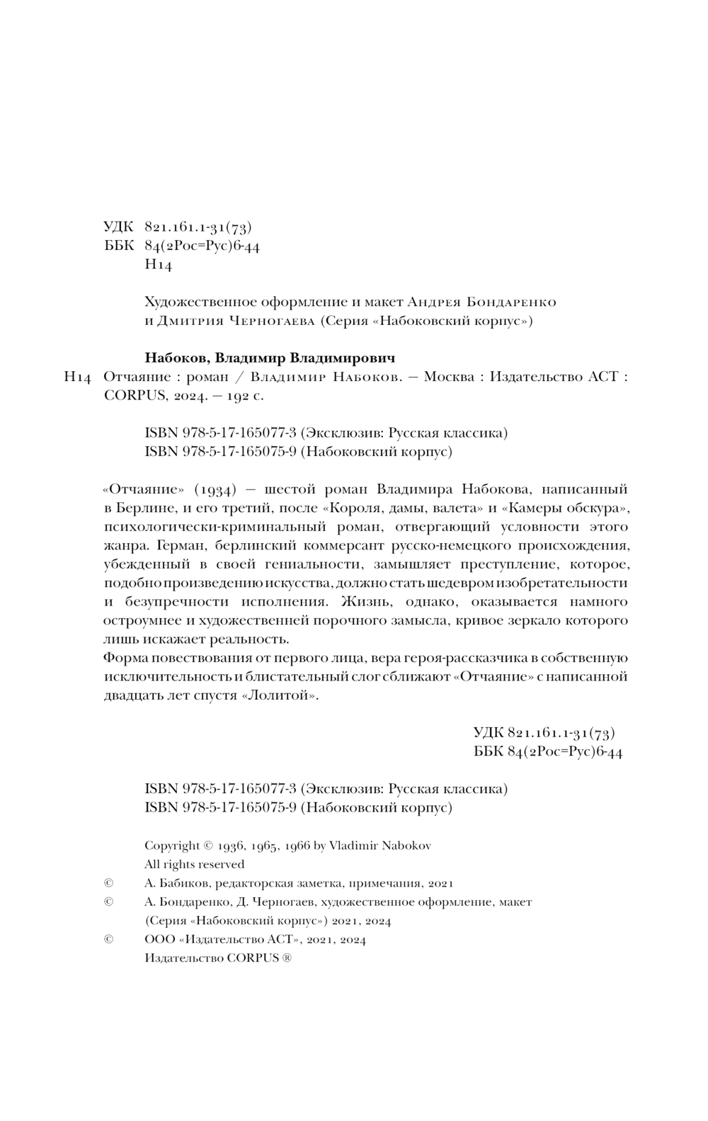 "Отчаяние" (1934) – шестой роман Владимира Набокова, написанный в Берлине, и его третий, после "Короля, дамы, валета" и "Камеры обскура", психологически-криминальный роман, отвергающий условности этого жанра. Герман, берлинский коммерсант русско-немецкого происхождения, убежденный в своей гениальности, замышляет преступление, которое, подобно произведению искусства, должно стать шедевром изобретательности и безупречности исполнения. Жизнь, однако, оказывается намного остроумнее и художественней порочного замысла, кривое зеркало которого лишь искажает реальность.