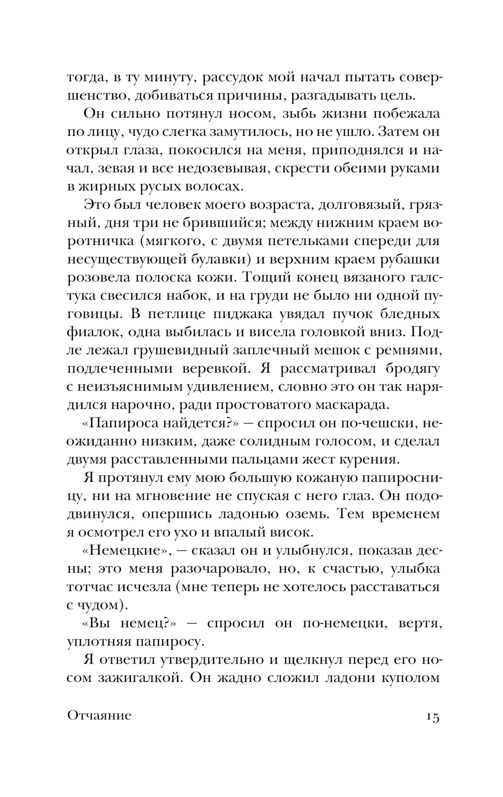 Форма повествования от первого лица, вера героя-рассказчика в собственную исключительность и блистательный слог сближают "Отчаяние" с написанной двадцать лет спустя "Лолитой".