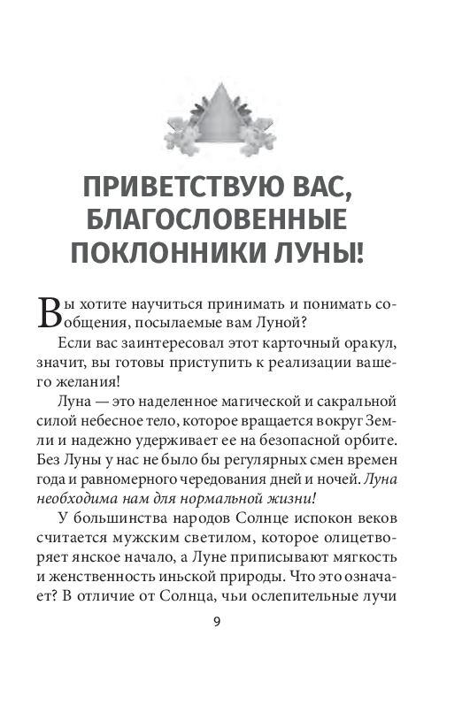 В инструкции Ясмин Боланд учит интерпретировать послания Луны и понимать ее символы. Луна служит идеальным каналом для передачи любых сообщений, связанных с нашими чувствами. Эмоции, в свою очередь, порождают мысли, которые определяют слова и действия, направленные на формирование наших судеб. Луна всегда готова помочь вам своими советами и подсказками. Используйте карты, чтобы задавать вопросы, и она будет показывать, что вас ждет впереди.