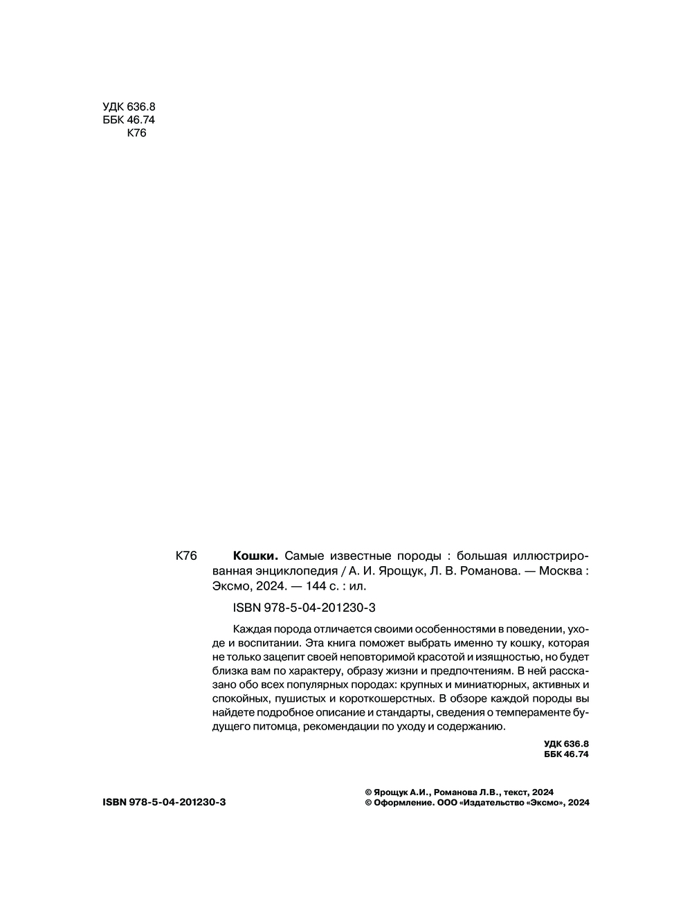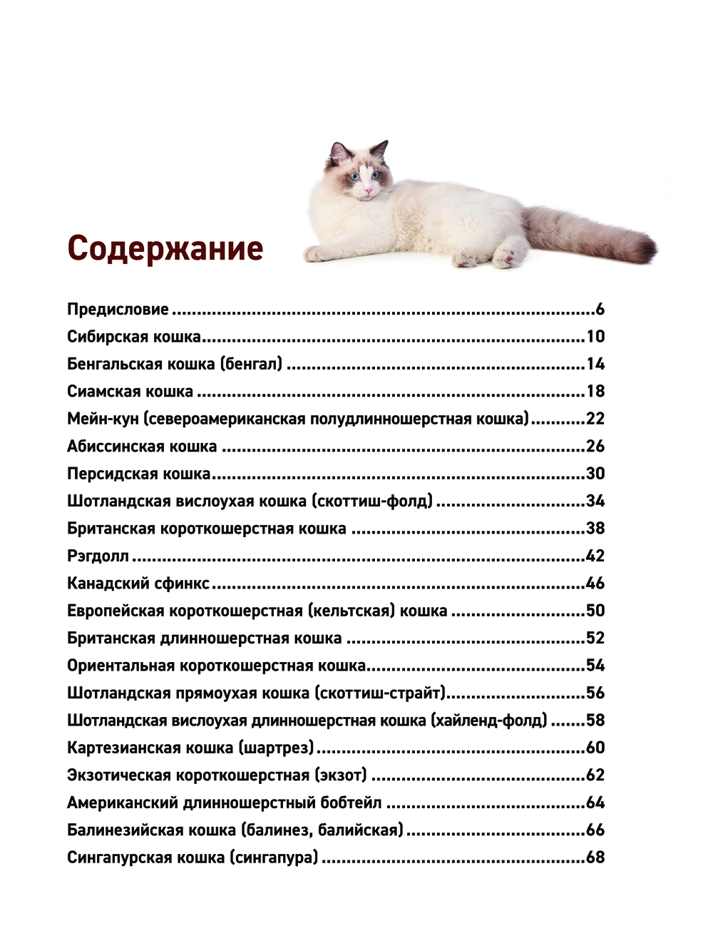 В этой энциклопедии вы найдете более 70 самых разных пород кошек: крупных и миниатюрных, активных и спокойных, мохнатых и короткошерстных, – и познакомитесь с представителями как самых популярных пород, таких как мейн-кун или шотландская вислоухая, так и редчайших, как лаперм или форин вайт.