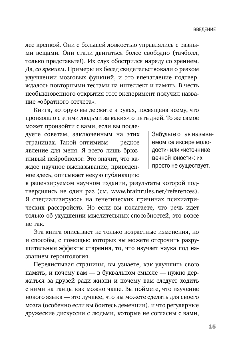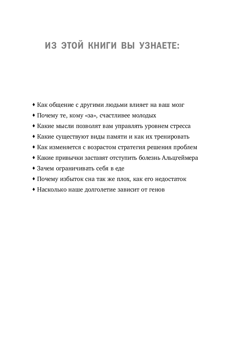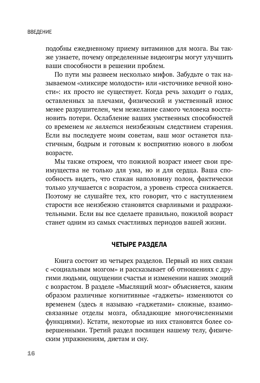 Эта книга описывает не только изменения мозга, происходящие с возрастом, но и способы, с помощью которых вы можете их предотвратить. В конце концов, возраст – просто выдумка скучных людей! А когда речь заходит о годах, оставленных за плечами, физический и умственный износ менее разрушителен, чем нежелание самого человека восстановить свои потери. Ослабление умственных способностей со временем не является неизбежным следствием прожитых лет. А если вы последуете советам из этой книги, ваш мозг останется пластичным, бодрым и готовым к восприятию нового в любом возрасте.