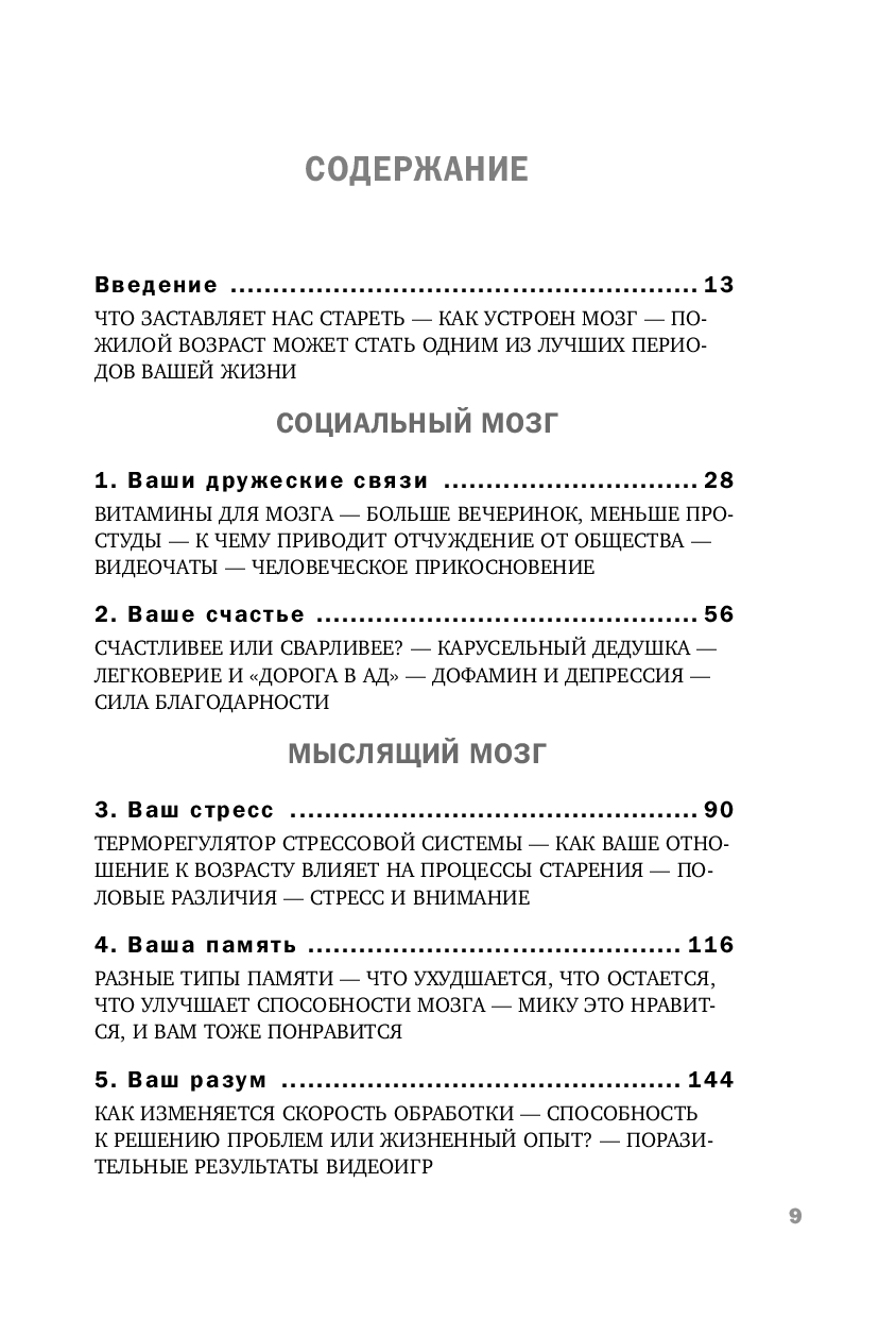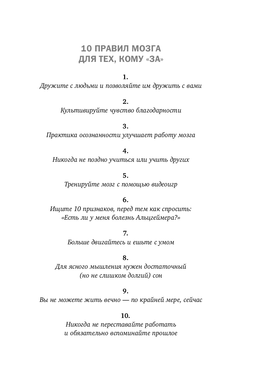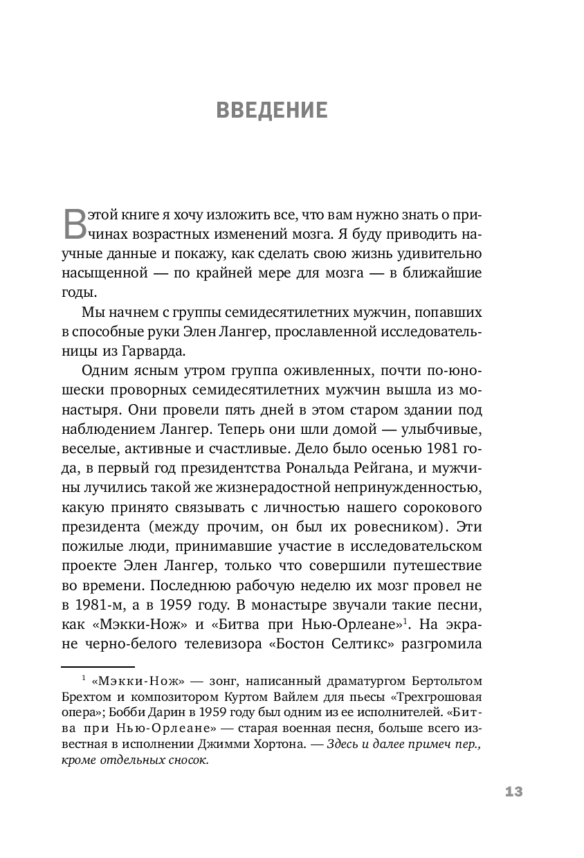 Эта книга описывает не только изменения мозга, происходящие с возрастом, но и способы, с помощью которых вы можете их предотвратить. В конце концов, возраст – просто выдумка скучных людей! А когда речь заходит о годах, оставленных за плечами, физический и умственный износ менее разрушителен, чем нежелание самого человека восстановить свои потери. Ослабление умственных способностей со временем не является неизбежным следствием прожитых лет. А если вы последуете советам из этой книги, ваш мозг останется пластичным, бодрым и готовым к восприятию нового в любом возрасте.