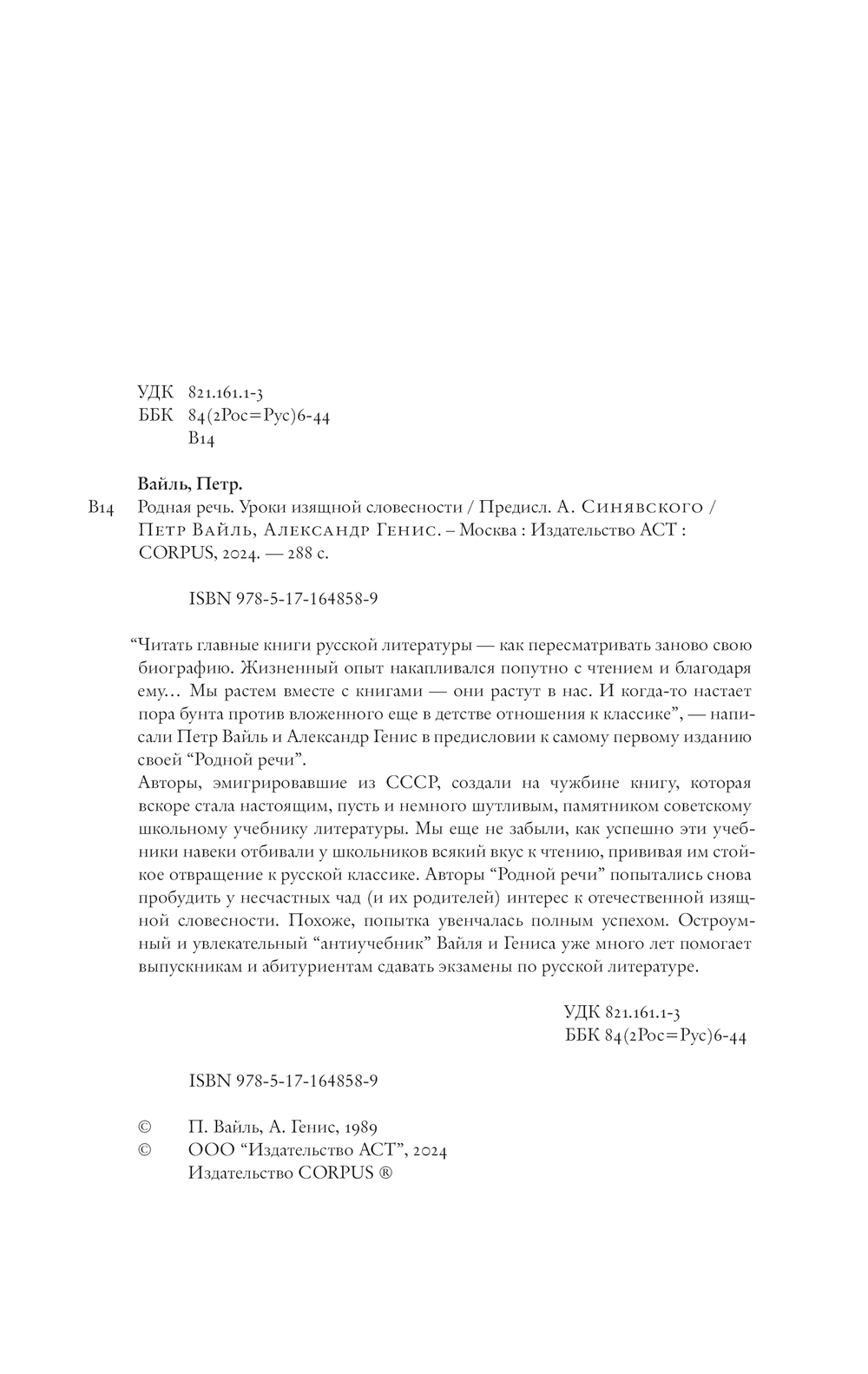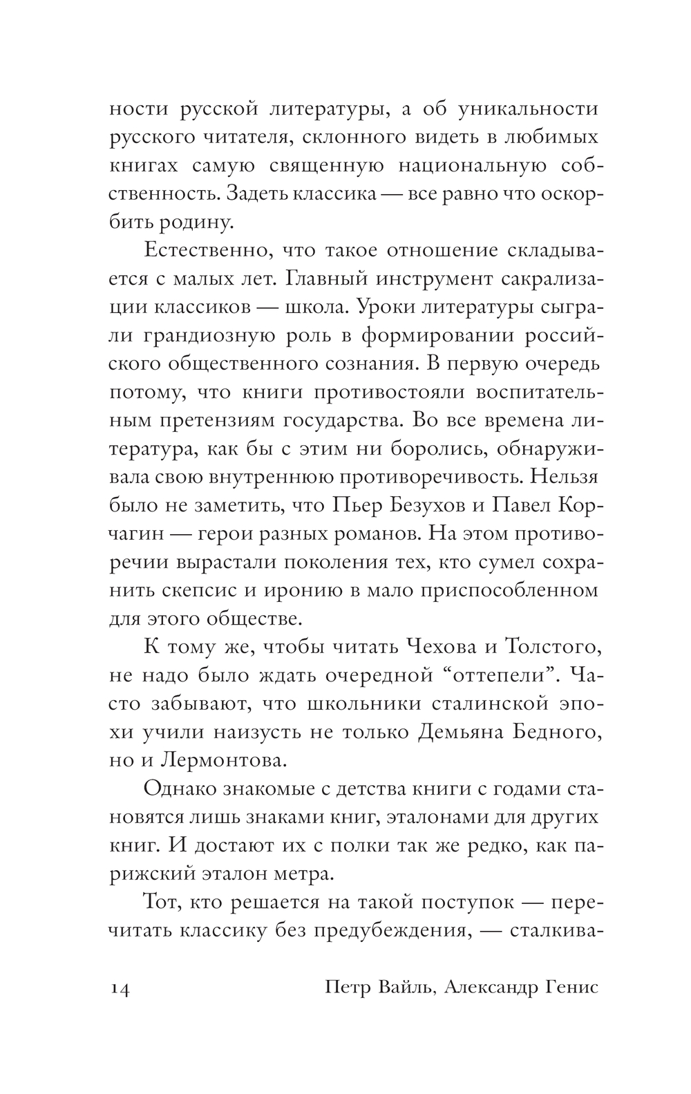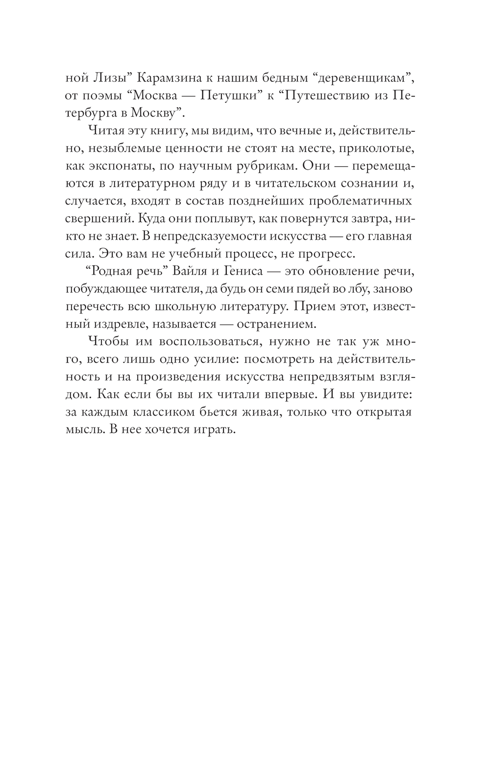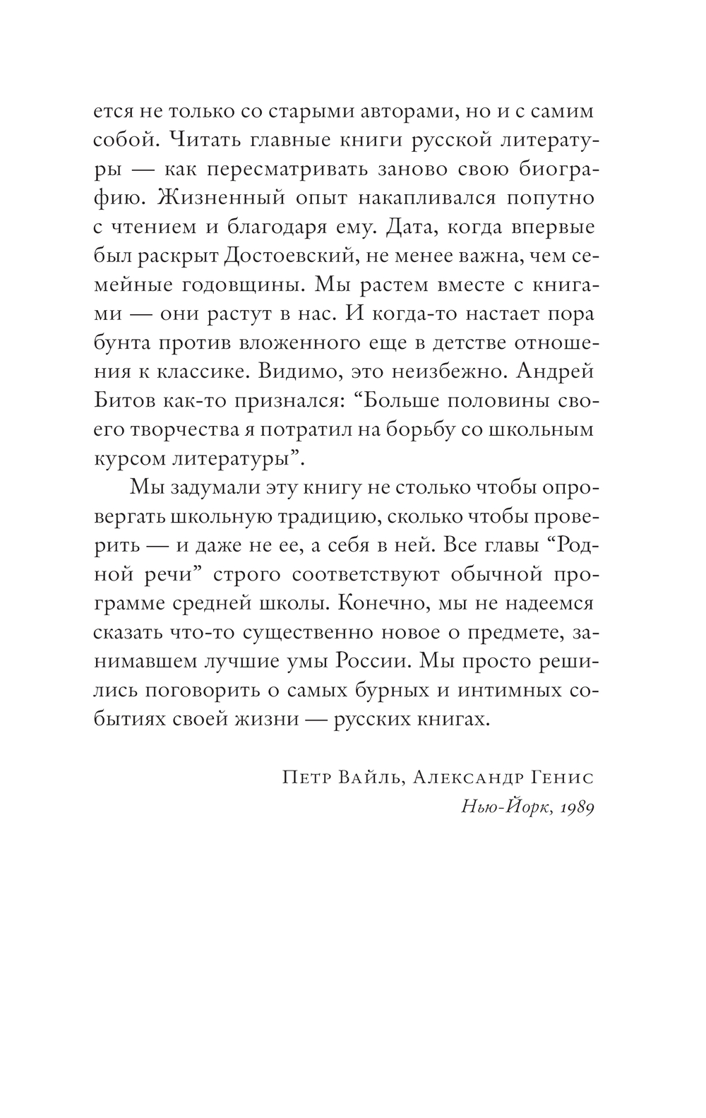 "Читать главные книги русской литературы – как пересматривать заново свою биографию. Жизненный опыт накапливался попутно с чтением и благодаря ему... Мы растем вместе с книгами – они растут в нас. И когда‑то настает пора бунта против вложенного еще в детстве отношения к классике", – написали Петр Вайль и Александр Генис в предисловии к самому первому изданию своей "Родной речи".