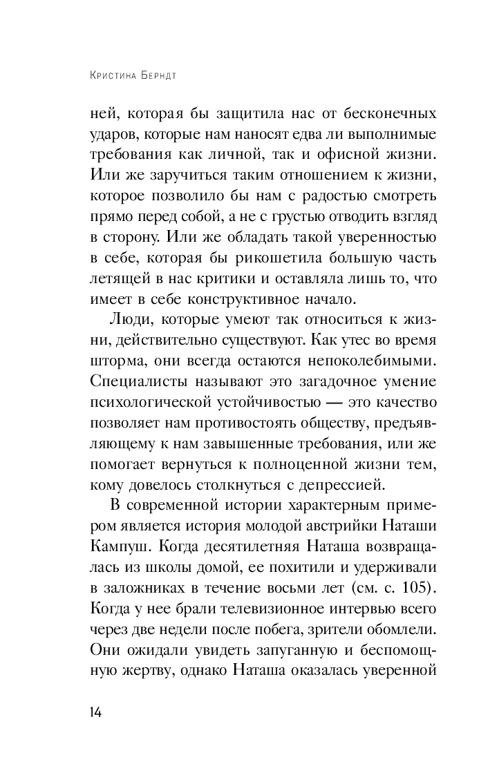 В своей книге доктор Кристина Берндт, выдающийся журналист и популяризатор науки, делится секретами психологической устойчивости, которая поможет снизить вероятность развития тревожных состояний и депрессии на фоне нервного напряжения.