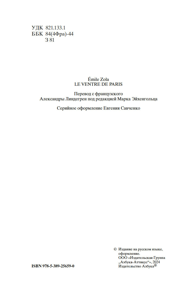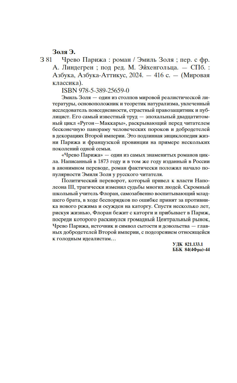 "Чрево Парижа" – один из самых знаменитых романов цикла. Написанный в 1873 году и в том же году изданный в России в анонимном переводе, роман фактически положил начало популярности Эмиля Золя у русского читателя.