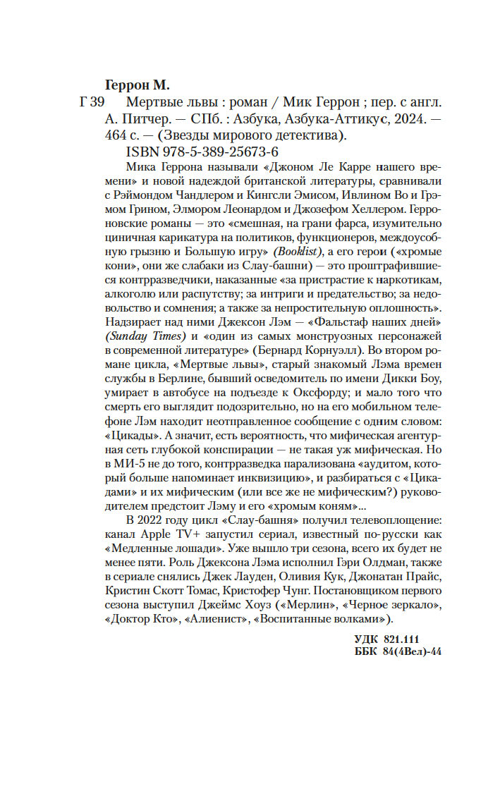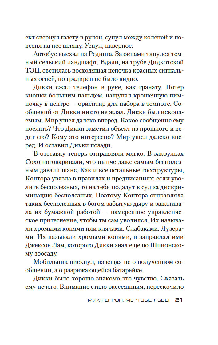 Во втором романе цикла, "Мертвые львы", старый знакомый Лэма времен службы в Берлине, бывший осведомитель по имени Дикки Боу, умирает в автобусе на подъезде к Оксфорду; и мало того, что смерть его выглядит подозрительно, но на его мобильном телефоне Лэм находит неотправленное сообщение с одним словом: "Цикады". А значит есть вероятность, что мифическая агентурная сеть глубокой конспирации – не такая уж мифическая. Но в МИ-5 не до того, контрразведка парализована "аудитом, который больше напоминает инквизицию", и разбираться с "Цикадами" и их мифическим (или все же не мифическим?) руководителем предстоит Лэму и его "хромым коням"...
