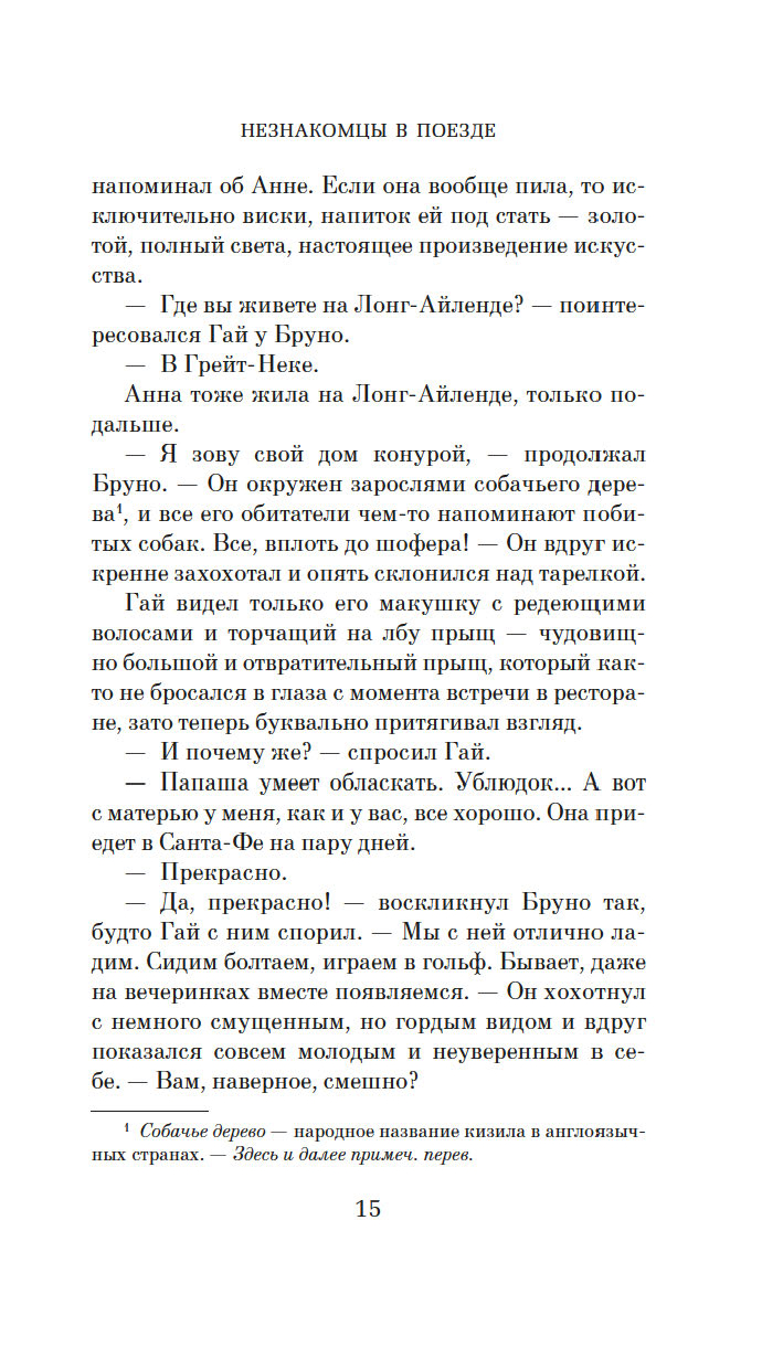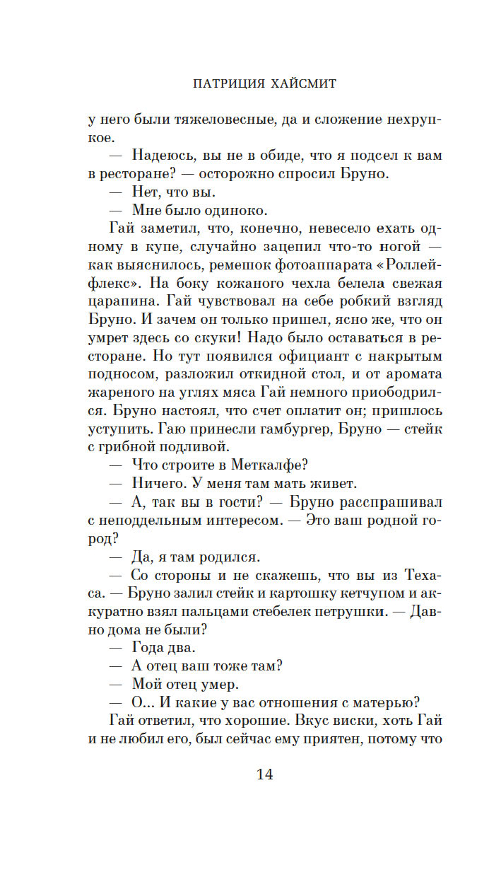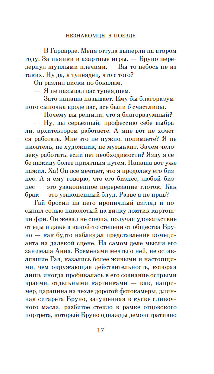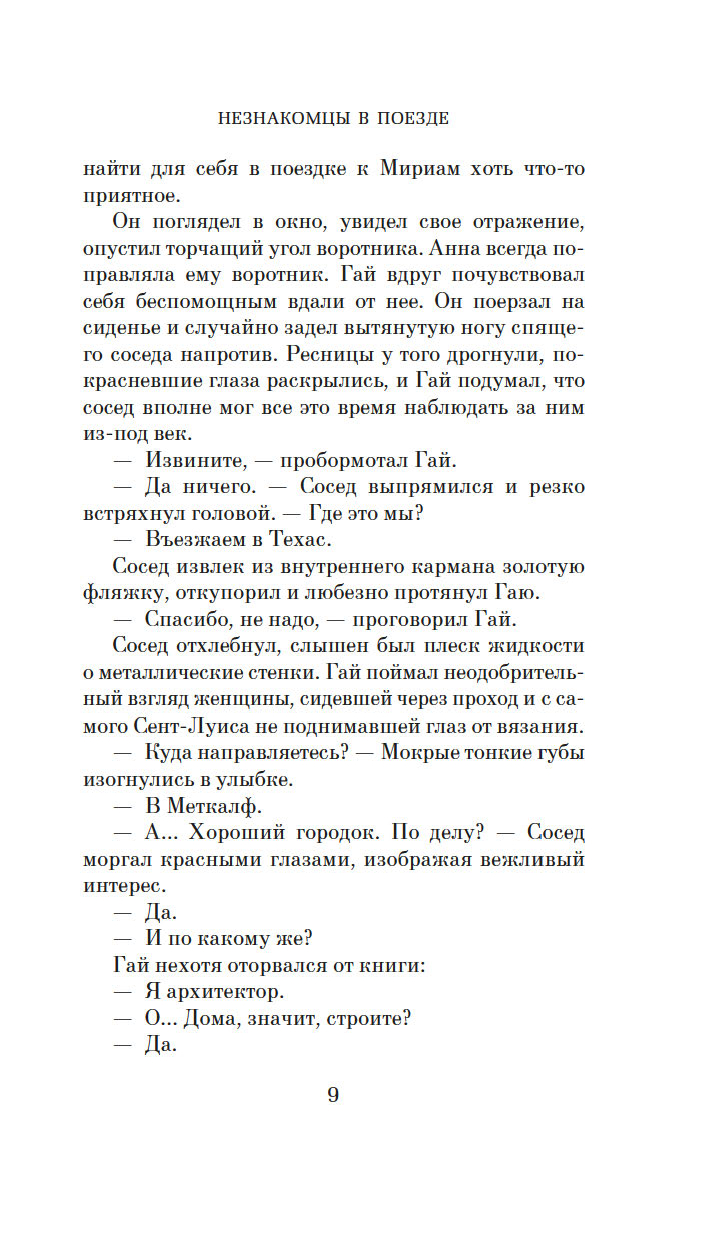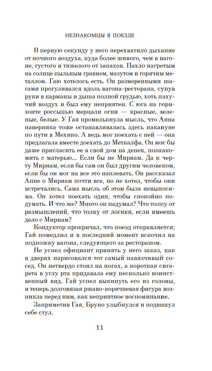 Как часто мы бываем откровенны со случайными попутчиками, не догадываясь, что это может грозить... соучастием в преступлении! В поезде, мчащемся на Запад, молодой преуспевающий архитектор Гай заводит с малосимпатичным незнакомцем ничего не значащий и ни к чему не обязывающий разговор, жалуясь на взаимоотношения с женой. И тот делает Гаю страшное и недвусмысленное предложение, от которого, как выясняется впоследствии, нельзя отказаться. На следующее утро все произошедшее кажется всего лишь дурным сном, но история только начинается, и вскоре Гай понимает, что его жизнь ему больше не принадлежит...