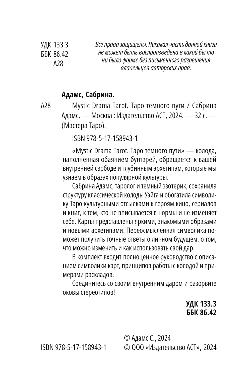 Сабрина Адамс, таролог и темный эзотерик, сохранила структуру классической системы Уэйта и обогатила символику Таро культурными отсылками к героям кино, сериалов и книг, к тем, кто не вписывается в нормы и не изменяет себе. Переосмысленная символика поможет получить точные ответы о личном будущем, о том, что можно изменить и как использовать свой дар.