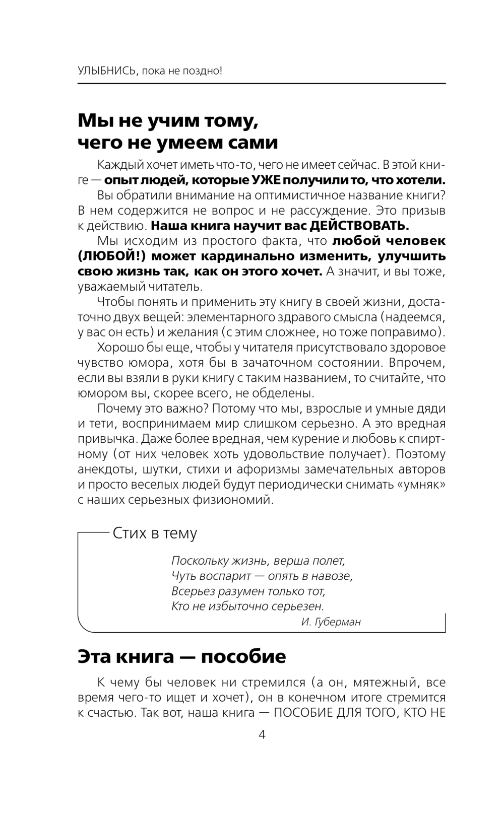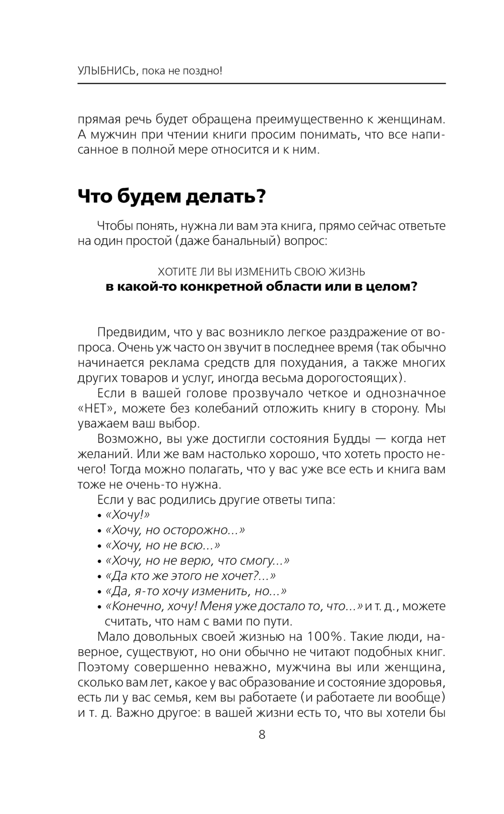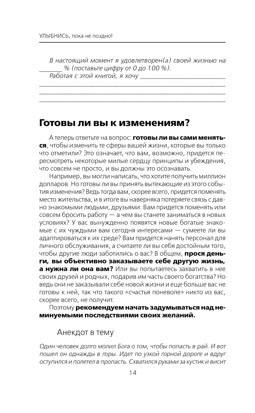 Человек – существо сложное, которому нужно долго учиться управлять набором заложенных в нем природой возможностей и реализовывать свой потенциал. Благодаря этой книге вы не столкнетесь больше с безразличием Жизни, а Жизнь не увидит вашего унылого выражения лица. Это пособие для тех, кто не просто мечтает о счастье, а уже осознал, что это такое, и готов сделать шаги для его достижения, стать для себя и учеником, и учителем.