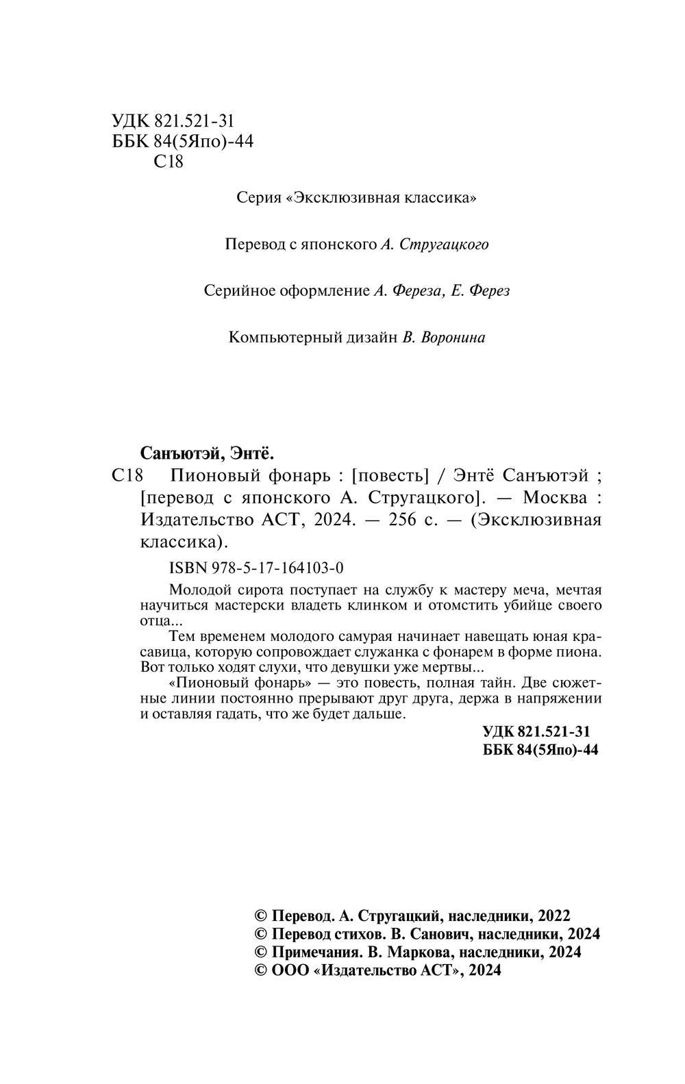 "Пионовый фонарь" – это повесть, полная тайн. Две сюжетные линии постоянно прерывают друг друга, держа в напряжении и оставляя гадать, что же будет дальше.