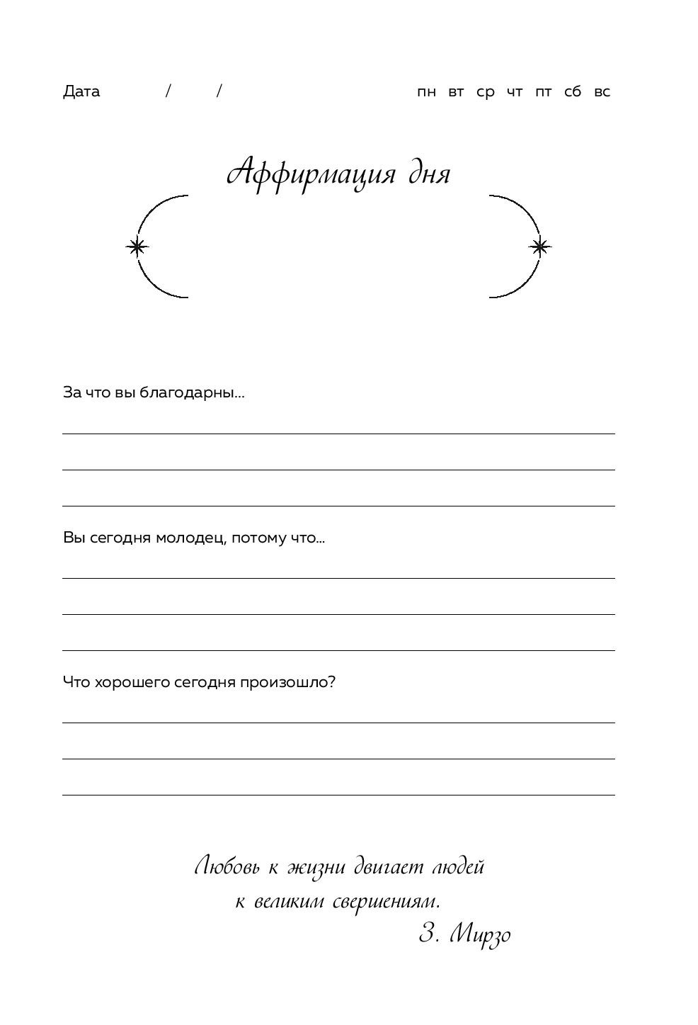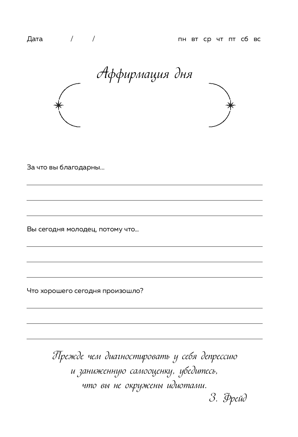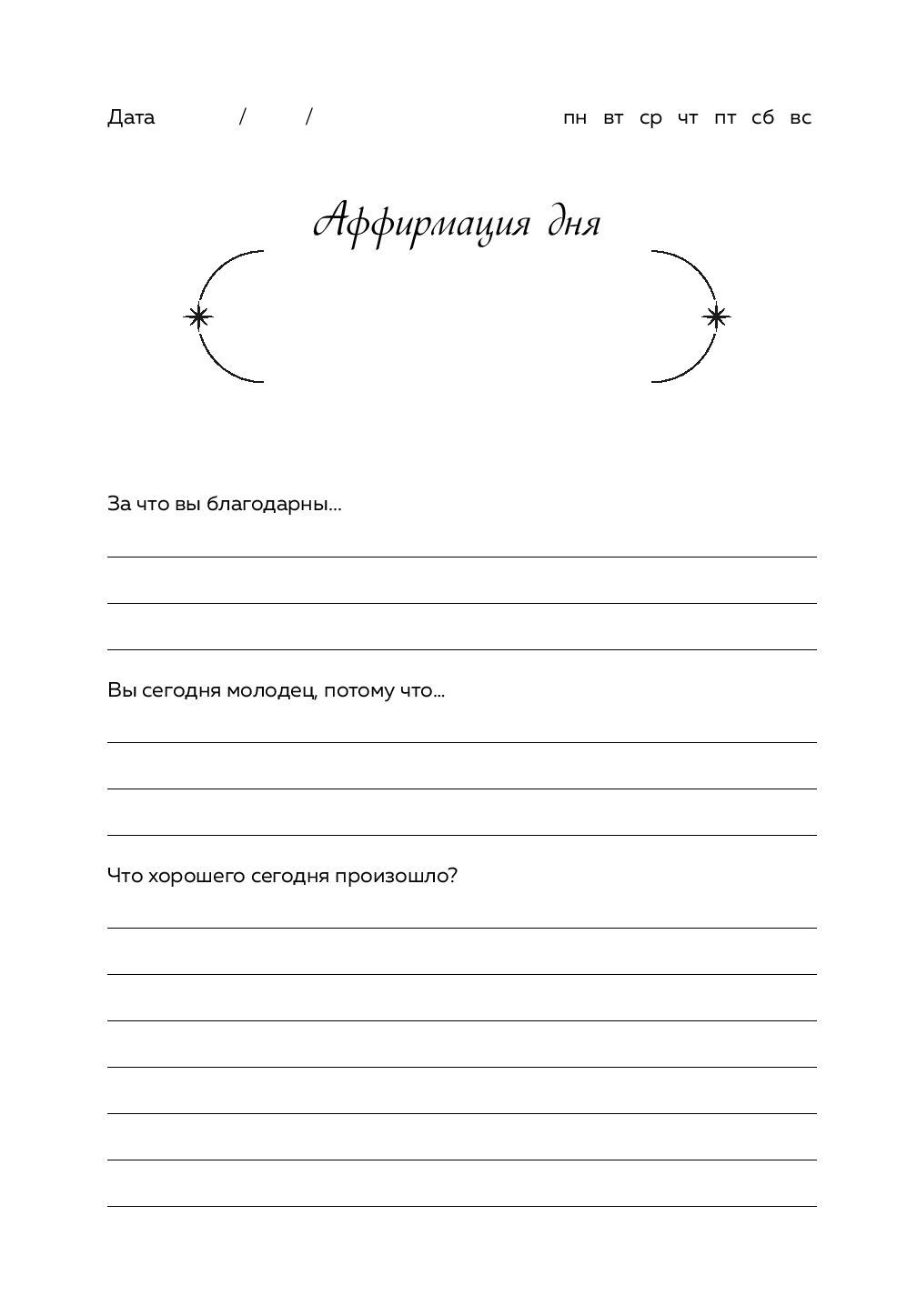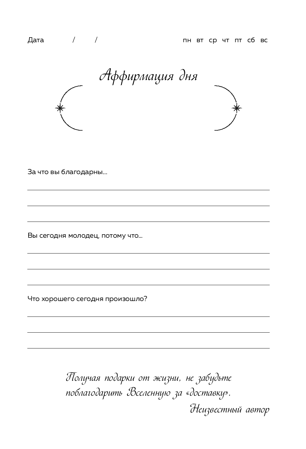 Дневник благодарности – это помощник в ежедневной практике любви к себе и миру. Заполнять его могут мужчины и женщины всех возрастов. Внутри вы найдете вопросы для самопознания, а также блок для аффирмаций – позитивных установок, которые помогут выработать привычку концентрироваться на хорошем.