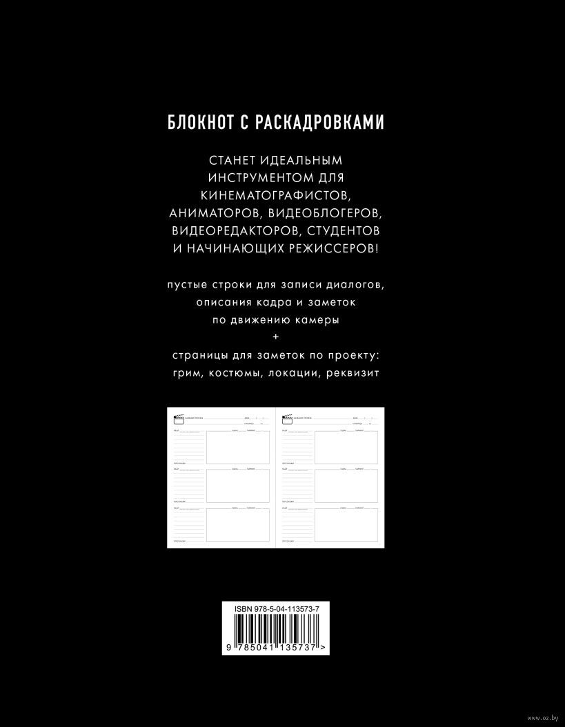 Визуализируйте свой проект, делая наброски каждого кадра и комментируя важные аспекты снимка, включая диалог, действие и перемещение камеры. С помощью этого блокнота вы сэкономите время и бюджет, а также избежите ненужной настройки производства, просто набросав сначала свои идеи. Возьмите его с собой, такой блокнот легко может поместиться в любом рюкзаке или портфеле.