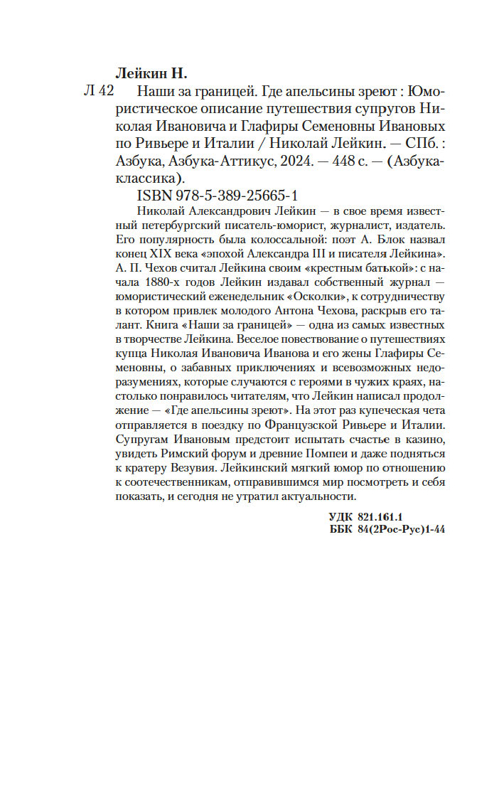 Книга "Наши за границей" – одна из самых известных в творчестве Лейкина. Веселое повествование о путешествиях купца Николая Ивановича Иванова и его жены Глафиры Семеновны, о забавных приключениях и всевозможных недоразумениях, которые случаются с героями в чужих краях, настолько понравилось читателям, что Лейкин написал продолжение – "Где апельсины зреют". На этот раз купеческая чета отправляется в поездку по Французской Ривьере и Италии. Супругам Ивановым предстоит испытать счастье в казино, увидеть Римский форум и древние Помпеи и даже подняться к кратеру Везувия.