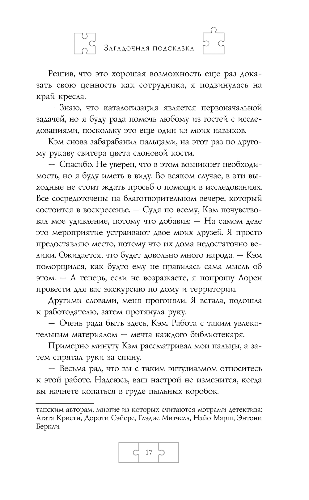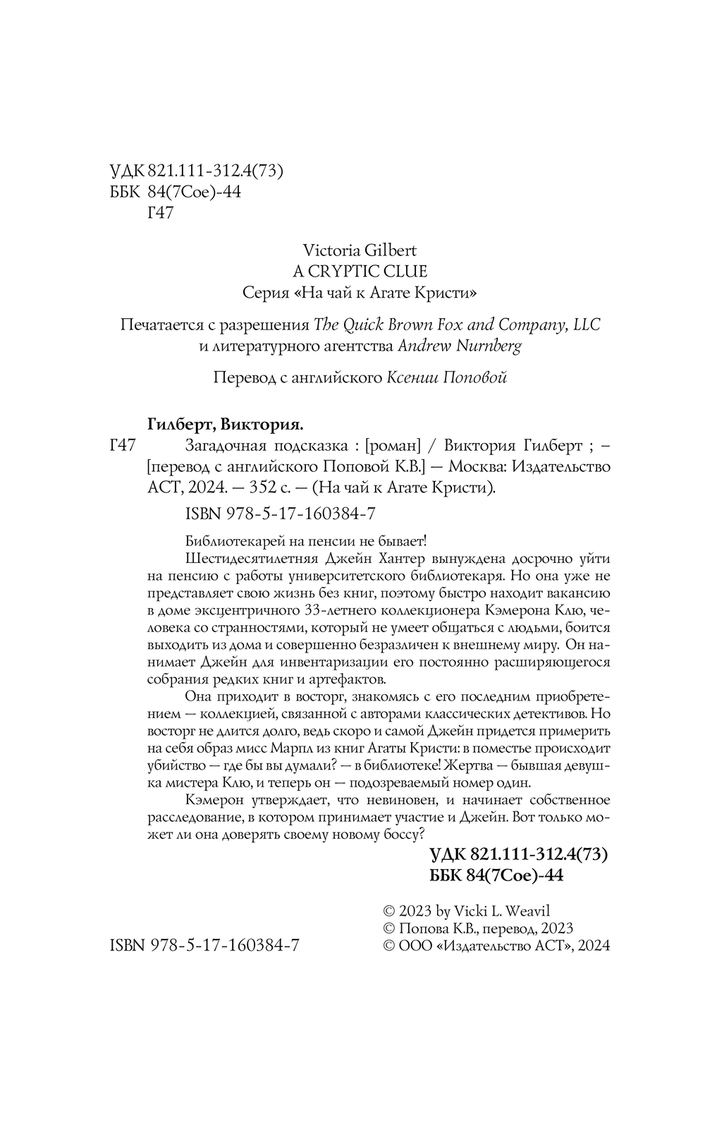 Она приходит в восторг, знакомясь с его последним приобретением – коллекцией, связанной с авторами классических детективов. Но восторг не длится долго, ведь скоро и самой Джейн придется примерить на себя образ мисс Марпл из книг Агаты Кристи: в поместье происходит убийство – где бы вы думали? – в библиотеке! Жертва – бывшая девушка мистера Клю, и теперь он – подозреваемый номер один.
