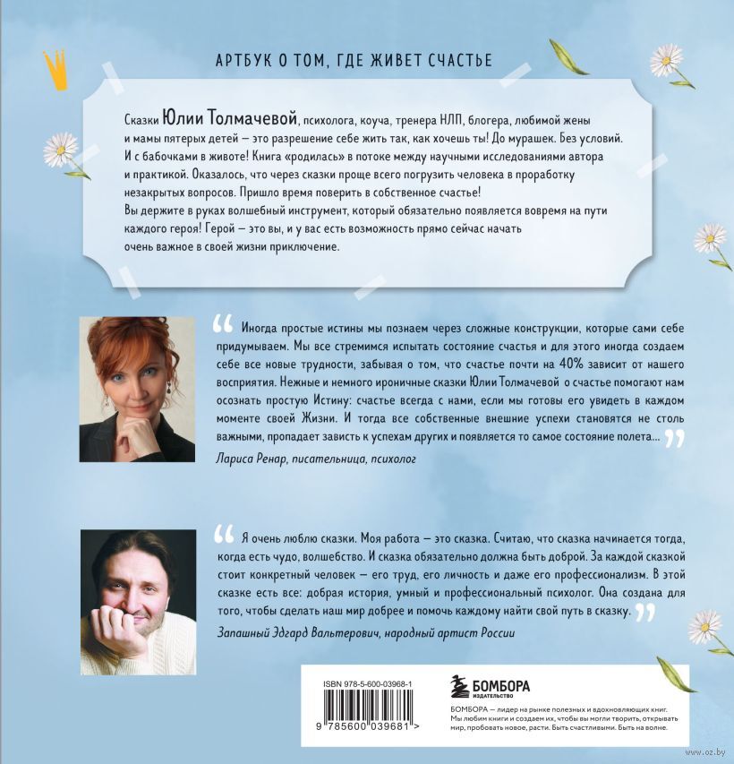 Автора этого вдохновляющего арт-бука – Юлию Толмачеву – называют профессором счастья. Она исследует эту тему фундаментально и глубоко. Книга родилась в потоке между научными экспериментами и практикой. Оказалось, что именно через сказку проще всего погрузить человека и в состояние веры в то, что счастье уже стучится в дверь, и в проработку собственных проблем.