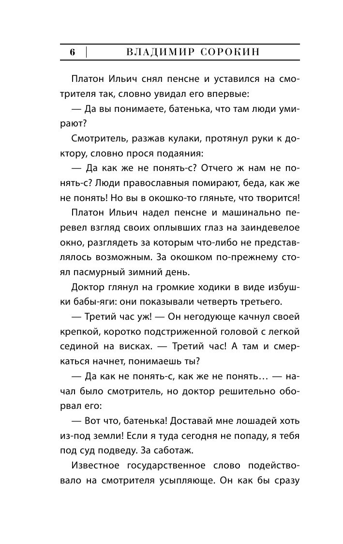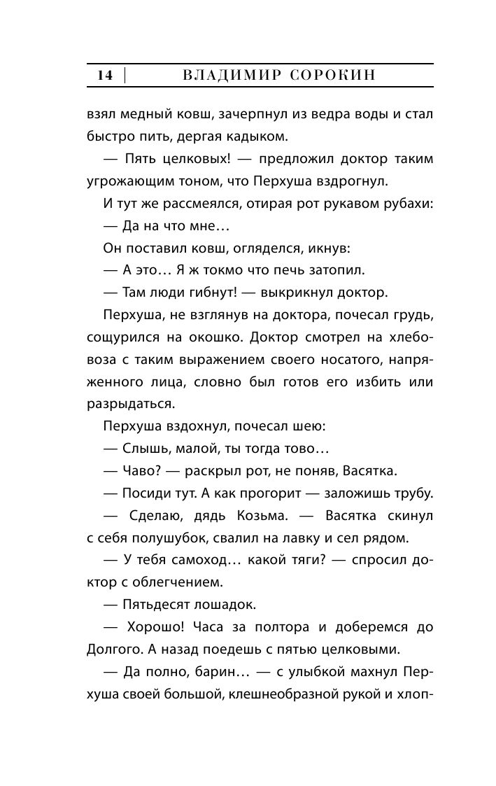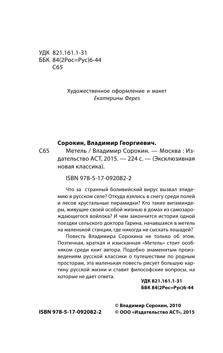 Повесть Владимира Сорокина не только об этом. Поэтичная, краткая и изысканная "Метель" стоит особняком среди книг автора. Подобно знаменитым произведениям русской классики о путешествии по родным просторам, эта маленькая повесть рисует большую картину русской жизни и ставит философские вопросы, на которые не дает ответа.
