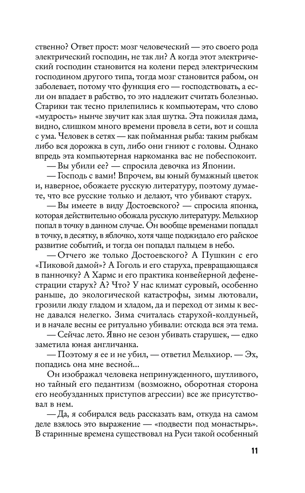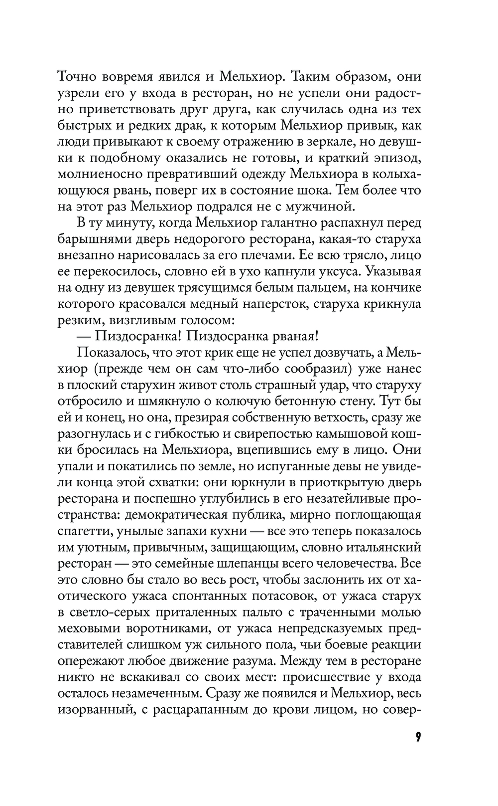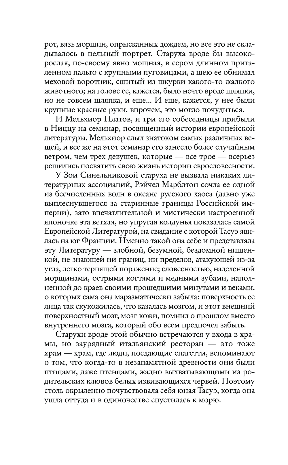 Здесь раздваиваются герои, а, перевернув страницу, можно попасть в отдельный фантасмагоричный сюжет и быть унесенным живым потоком слов, вагонетками синонимов, языковой игрой, ироничными пародиями, неожиданными отступлениями, мозаичностью литературных и культурных отсылок. И даже открывается роман внезапно, вполне в хармсовском духе – с драки со старухой.