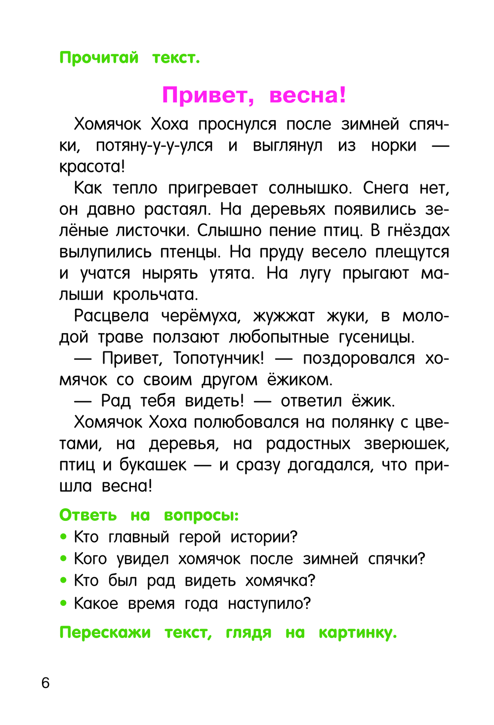 На каждом развороте книги – занимательная история и яркая иллюстрация. Небольшие тексты состоят из простых слов – это помогает ребёнку без труда понимать основной смысл прочитанного. К каждому тексту даны дополнительные вопросы – благодаря им легче запомнить все детали. Наглядные картинки становятся подсказками и существенно облегчают процесс пересказа. Подготовьте ребёнка к школе с пользой и удовольствием!