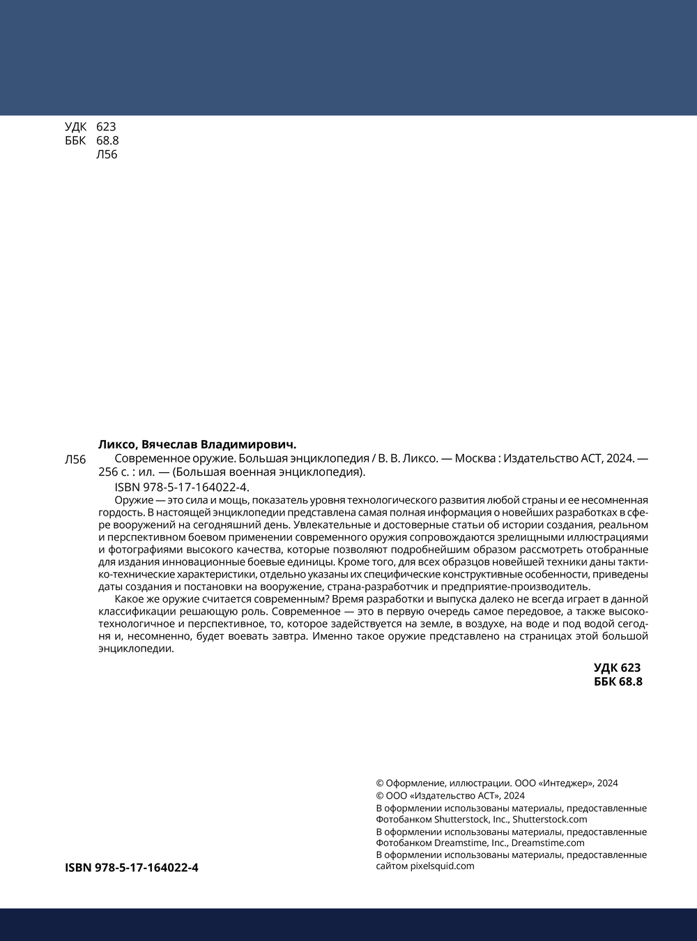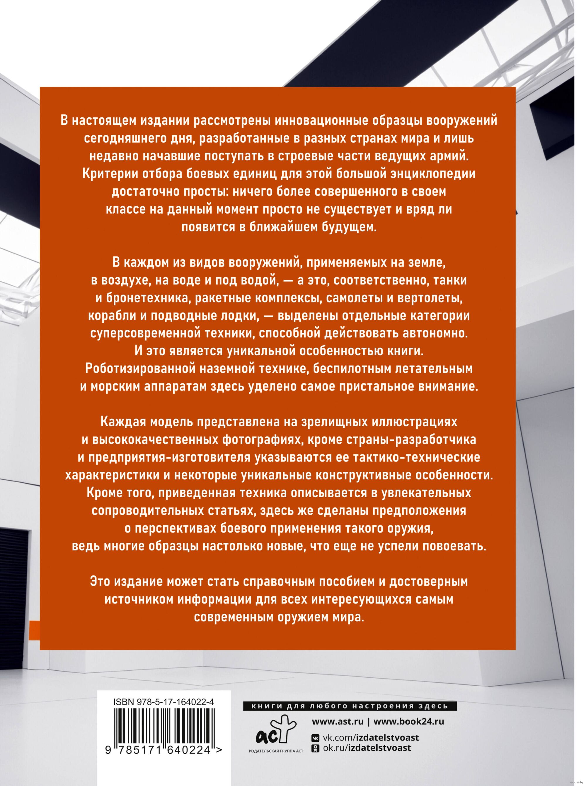Оружие – это сила и мощь, показатель уровня технологического развития любой страны и ее несомненная гордость. В настоящей энциклопедии представлена самая полная информация о новейших разработках в сфере вооружений на сегодняшний день. Увлекательные и достоверные статьи об истории создания, реальном и перспективном боевом применении современного оружия сопровождаются зрелищными иллюстрациями и фотографиями высокого качества, которые позволяют подробнейшим образом рассмотреть отобранные для издания инновационные боевые единицы. Кроме того, для всех образцов новейшей техники даны тактико-технические характеристики, отдельно указаны их специфические конструктивные особенности, приведены даты создания и постановки на вооружение, страна-разработчик и предприятие-производитель.
