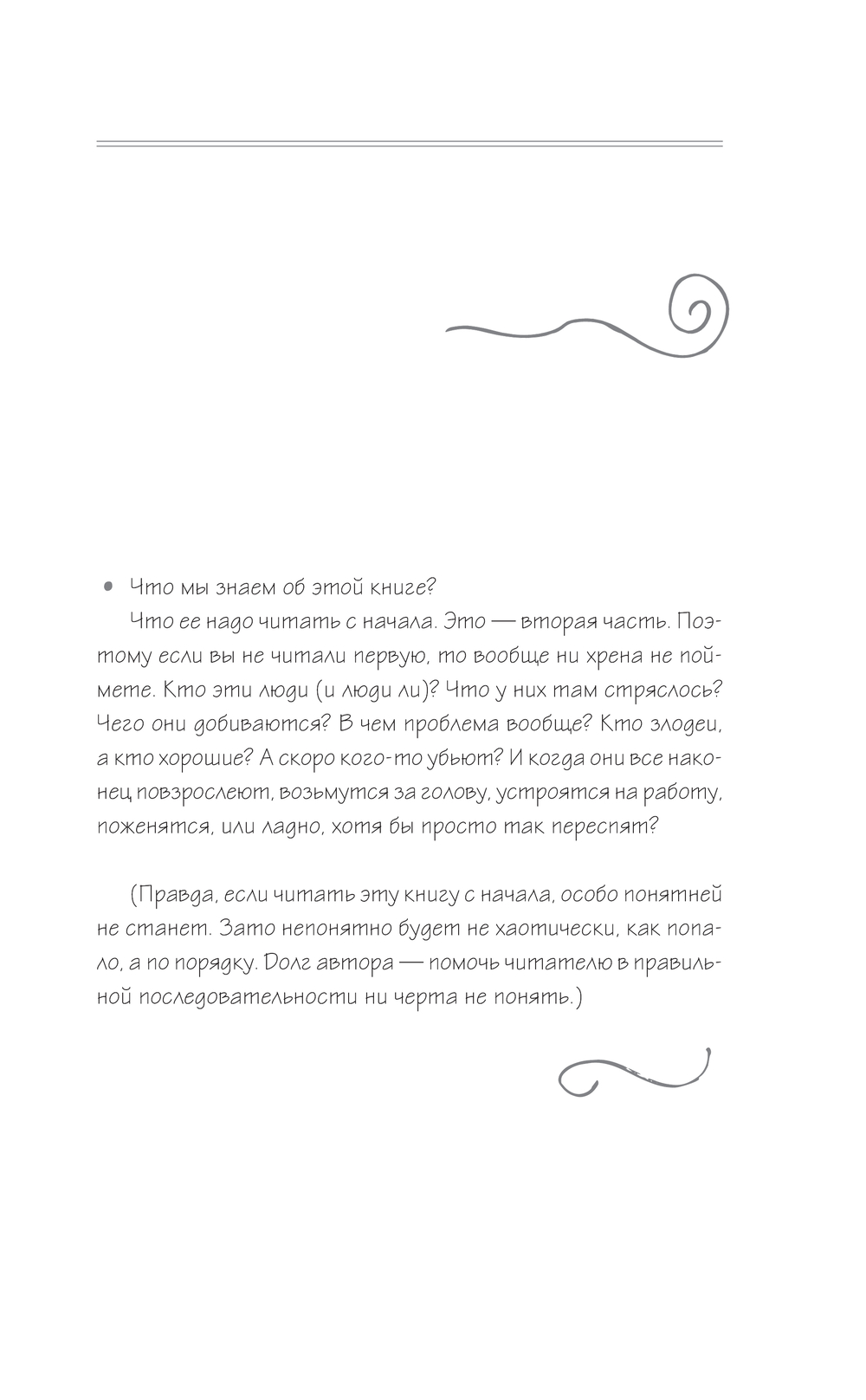 Что ее лучше читать с начала. Это – вторая часть. Если вы не читали первую, то вообще ничего не поймете. Кто эти люди? Что там у них стряслось? Чего они добиваются? Зачем ловят книги? Почему до сих пор пить не бросили? Какой, прости господи, Эль-Ютокан?